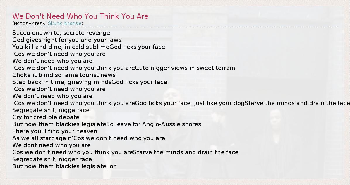 Succulent white, secrete revenge God gives right for you and your laws You kill and dine, in cold sublimeGod licks your face 'Cos we don't need who you are We don't need who you are 'Cos we don't need who you think you areCute nigger views in sweet terrain Choke it blind so lame tourist news Step back in time, grieving mindsGod licks your face 'Cos we don't need who you are We don't need who you are 'Cos we don't need who you think you areGod licks your face, just like your dogStarve the minds and drain the face Segregate shit, nigga race Cry for credible debate But now them blackies legislateSo leave for Anglo-Aussie shores There you'll find your heaven As we all start again'Cos we don't need who you are We dont need who you are Cos we don't need who you think you areStarve the minds and drain the face Segregate shit, nigger race But now them blackies legislate, oh