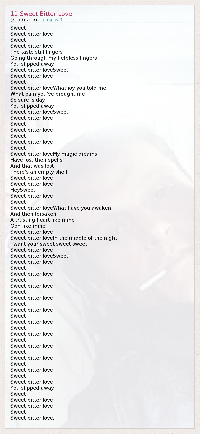 Sweet Sweet bitter love Sweet Sweet bitter love The taste still lingers Going through my helpless fingers You slipped away Sweet bitter loveSweet Sweet bitter love Sweet Sweet bitter loveWhat joy you told me What pain you've brought me So sure is day You slipped away Sweet bitter loveSweet Sweet bitter love Sweet Sweet bitter love Sweet Sweet bitter love Sweet Sweet bitter loveMy magic dreams Have lost their spells And that was lost There's an empty shell Sweet bitter love Sweet bitter love HeySweet Sweet bitter love Sweet Sweet bitter loveWhat have you awaken And then forsaken A trusting heart like mine Ooh like mine Sweet bitter love Sweet bitter loveIn the middle of the night I want your sweet sweet sweet Sweet bitter love Sweet bitter loveSweet Sweet bitter love Sweet Sweet bitter love Sweet Sweet bitter love Sweet Sweet bitter love Sweet Sweet bitter love Sweet Sweet bitter love Sweet Sweet bitter love Sweet Sweet bitter love Sweet Sweet bitter love Sweet Sweet bitter love Sweet Sweet bitter love You slipped away Sweet Sweet bitter love Sweet bitter love Sweet Sweet bitter love.