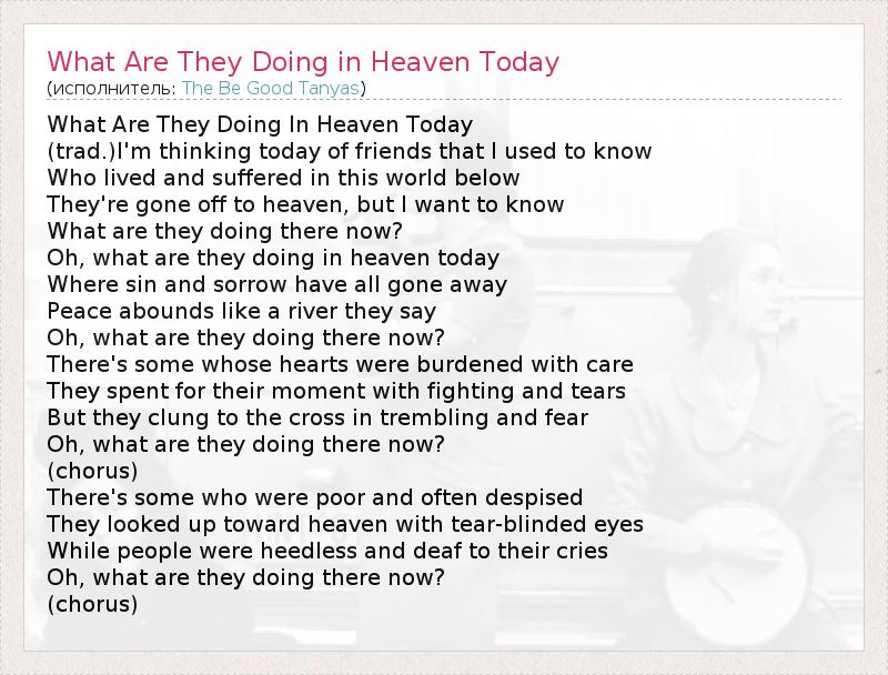 ГлавнаяИсполнителиThe Be Good TanyasWhat Are They Doing in Heaven Today