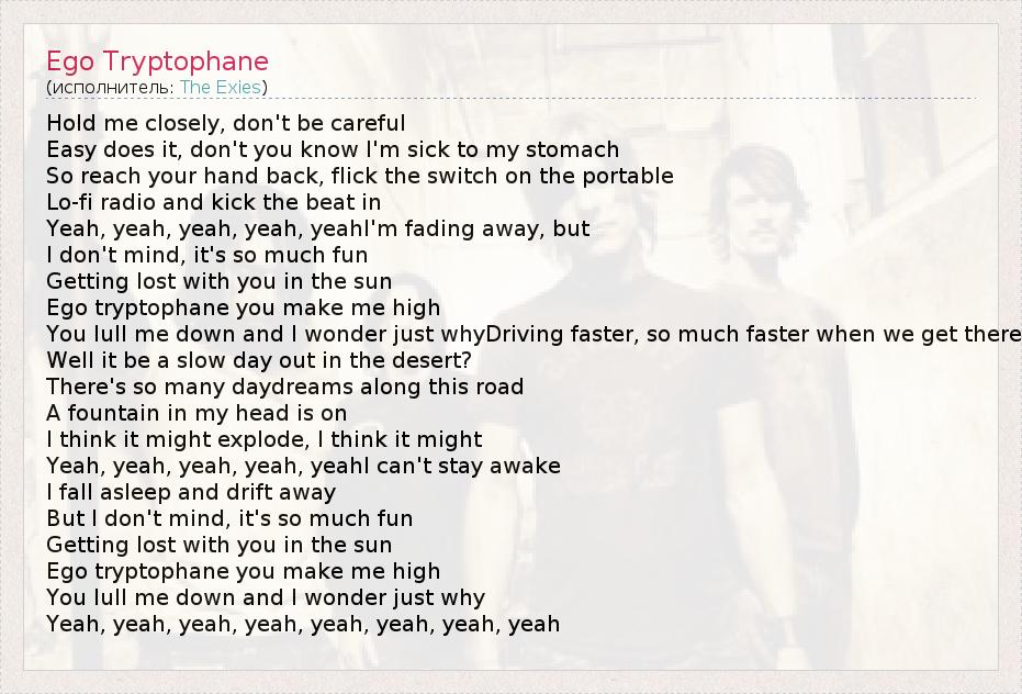 Hold me closely, don't be careful Easy does it, don't you know I'm sick to my stomach So reach your hand back, flick the switch on the portable Lo-fi radio and kick the beat in Yeah, yeah, yeah, yeah, yeahI'm fading away, but I don't mind, it's so much fun Getting lost with you in the sun Ego tryptophane you make me high You lull me down and I wonder just whyDriving faster, so much faster when we get there Well it be a slow day out in the desert? There's so many daydreams along this road A fountain in my head is on I think it might explode, I think it might Yeah, yeah, yeah, yeah, yeahI can't stay awake I fall asleep and drift away But I don't mind, it's so much fun Getting lost with you in the sun Ego tryptophane you make me high You lull me down and I wonder just why Yeah, yeah, yeah, yeah, yeah, yeah, yeah, yeah