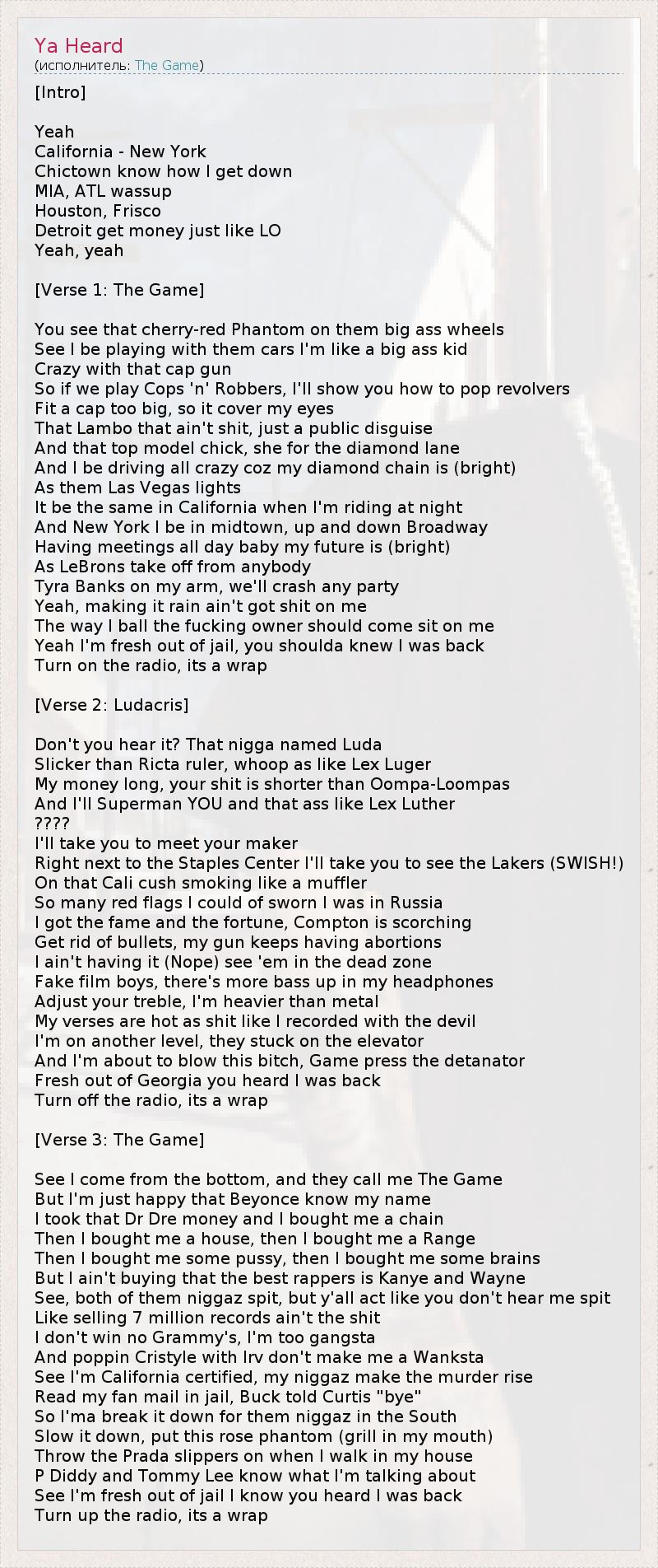 Это интересно:Джейсон Тейлор (AKA The Game) родился 27 ноября 1979 года прославленном пригороде Лос-Анджелеса, Комптоне. Прозвище Game («игра») музыканту дала бабушка, мотивируя это тем, что внук постоянно в игре – от баскетбола и велосипеда до музыки «игр» между уличными бандами. Семейные проблемы, связанные с изнасилованием сестры рэппера его отцом, заставили провести его в детском доме с 3 по 9 класс. «Мое детство... продолжение