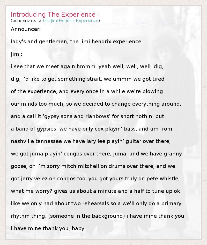 А как ты думаешь, о чем песня "Introducing The Experience" ?