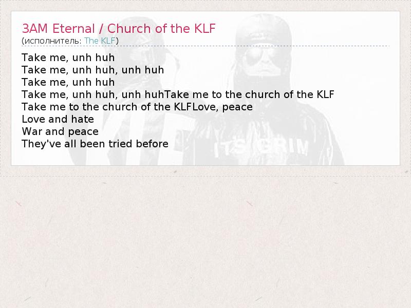 Take me, unh huh, unh huhTake me to the church of the KLF