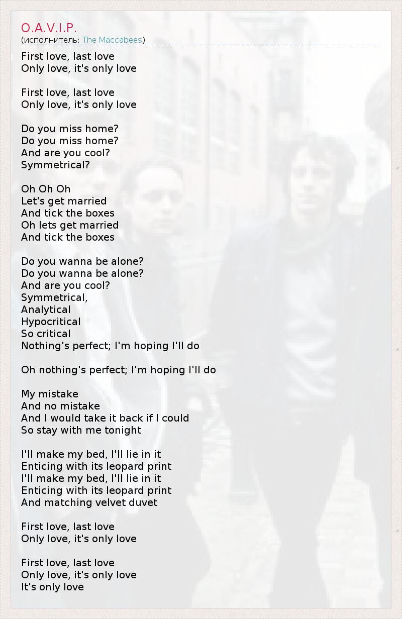 First love, last love Only love, it's only love First love, last love Only love, it's only love Do you miss home? Do you miss home? And are you cool? Symmetrical? Oh Oh Oh Let's get married And tick the boxes Oh lets get married And tick the boxes Do you wanna be alone? Do you wanna be alone? And are you cool? Symmetrical, Analytical Hypocritical So critical Nothing's perfect; I'm hoping I'll do Oh nothing's perfect; I'm hoping I'll do My mistake And no mistake And I would take it back if I could So stay with me tonight I'll make my bed, I'll lie in it Enticing with its leopard print I'll make my bed, I'll lie in it Enticing with its leopard print And matching velvet duvet First love, last love Only love, it's only love First love, last love Only love, it's only love It's only love