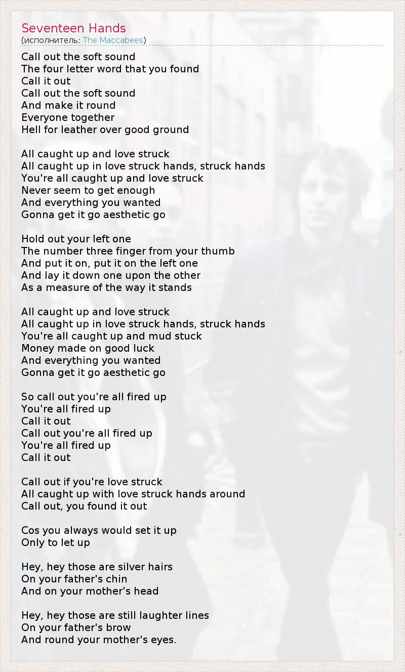 Call out the soft sound The four letter word that you found Call it out Call out the soft sound And make it round Everyone together Hell for leather over good ground All caught up and love struck All caught up in love struck hands, struck hands You're all caught up and love struck Never seem to get enough And everything you wanted Gonna get it go aesthetic go Hold out your left one The number three finger from your thumb And put it on, put it on the left one And lay it down one upon the other As a measure of the way it stands All caught up and love struck All caught up in love struck hands, struck hands You're all caught up and mud stuck Money made on good luck And everything you wanted Gonna get it go aesthetic go So call out you're all fired up You're all fired up Call it out Call out you're all fired up You're all fired up Call it out Call out if you're love struck All caught up with love struck hands around Call out, you found it out Cos you always would set it up Only to let up Hey, hey those are silver hairs On your father's chin And on your mother's head Hey, hey those are still laughter lines On your father's brow And round your mother's eyes.