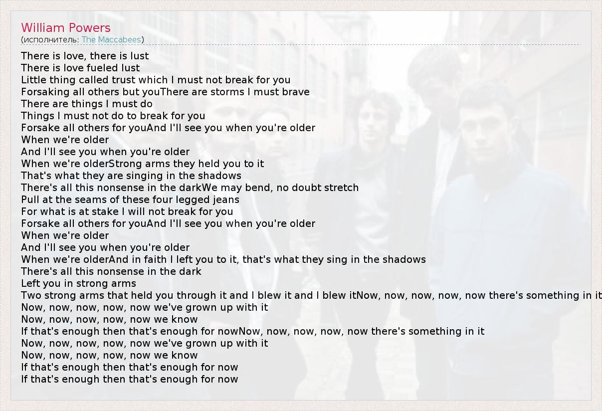 There is love, there is lust There is love fueled lust Little thing called trust which I must not break for you Forsaking all others but youThere are storms I must brave There are things I must do Things I must not do to break for you Forsake all others for youAnd I'll see you when you're older When we're older And I'll see you when you're older When we're olderStrong arms they held you to it That's what they are singing in the shadows There's all this nonsense in the darkWe may bend, no doubt stretch Pull at the seams of these four legged jeans For what is at stake I will not break for you Forsake all others for youAnd I'll see you when you're older When we're older And I'll see you when you're older When we're olderAnd in faith I left you to it, that's what they sing in the shadows There's all this nonsense in the dark Left you in strong arms Two strong arms that held you through it and I blew it and I blew itNow, now, now, now, now there's something in it Now, now, now, now, now we've grown up with it Now, now, now, now, now we know If that's enough then that's enough for nowNow, now, now, now, now there's something in it Now, now, now, now, now we've grown up with it Now, now, now, now, now we know If that's enough then that's enough for now If that's enough then that's enough for now