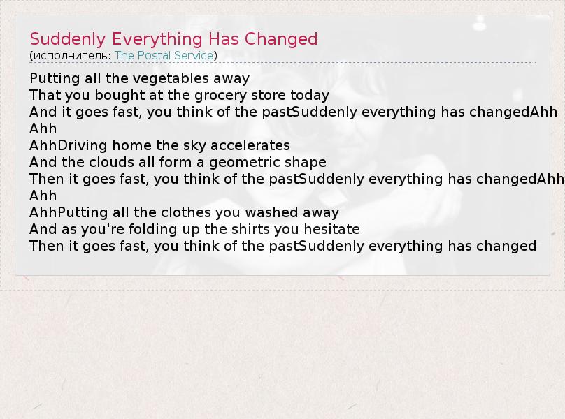 А как ты думаешь, о чем песня "Suddenly Everything Has Changed" ?