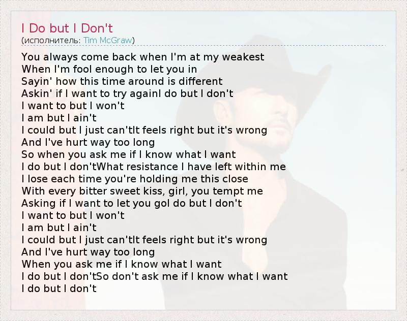 You always come back when I'm at my weakest When I'm fool enough to let you in Sayin' how this time around is different Askin' if I want to try againI do but I don't I want to but I won't I am but I ain't I could but I just can'tIt feels right but it's wrong And I've hurt way too long So when you ask me if I know what I want I do but I don'tWhat resistance I have left within me I lose each time you're holding me this close With every bitter sweet kiss, girl, you tempt me Asking if I want to let you goI do but I don't I want to but I won't I am but I ain't I could but I just can'tIt feels right but it's wrong And I've hurt way too long When you ask me if I know what I want I do but I don'tSo don't ask me if I know what I want I do but I don't