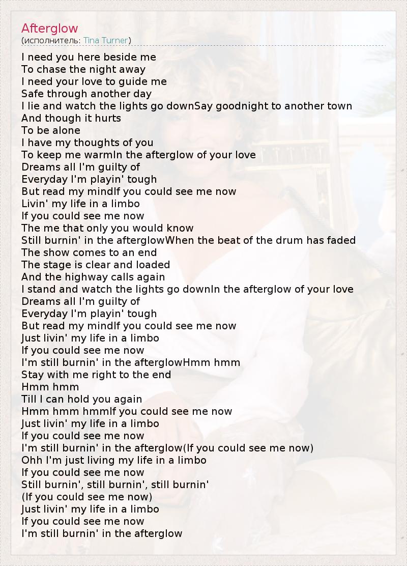 I need you here beside me To chase the night away I need your love to guide me Safe through another day I lie and watch the lights go downSay goodnight to another town And though it hurts To be alone I have my thoughts of you To keep me warmIn the afterglow of your love Dreams all I'm guilty of Everyday I'm playin' tough But read my mindIf you could see me now Livin' my life in a limbo If you could see me now The me that only you would know Still burnin' in the afterglowWhen the beat of the drum has faded The show comes to an end The stage is clear and loaded And the highway calls again I stand and watch the lights go downIn the afterglow of your love Dreams all I'm guilty of Everyday I'm playin' tough But read my mindIf you could see me now Just livin' my life in a limbo If you could see me now I'm still burnin' in the afterglowHmm hmm Stay with me right to the end Hmm hmm Till I can hold you again Hmm hmm hmmIf you could see me now Just livin' my life in a limbo If you could see me now I'm still burnin' in the afterglow(If you could see me now) Ohh I'm just living my life in a limbo If you could see me now Still burnin', still burnin', still burnin' (If you could see me now) Just livin' my life in a limbo If you could see me now I'm still burnin' in the afterglow