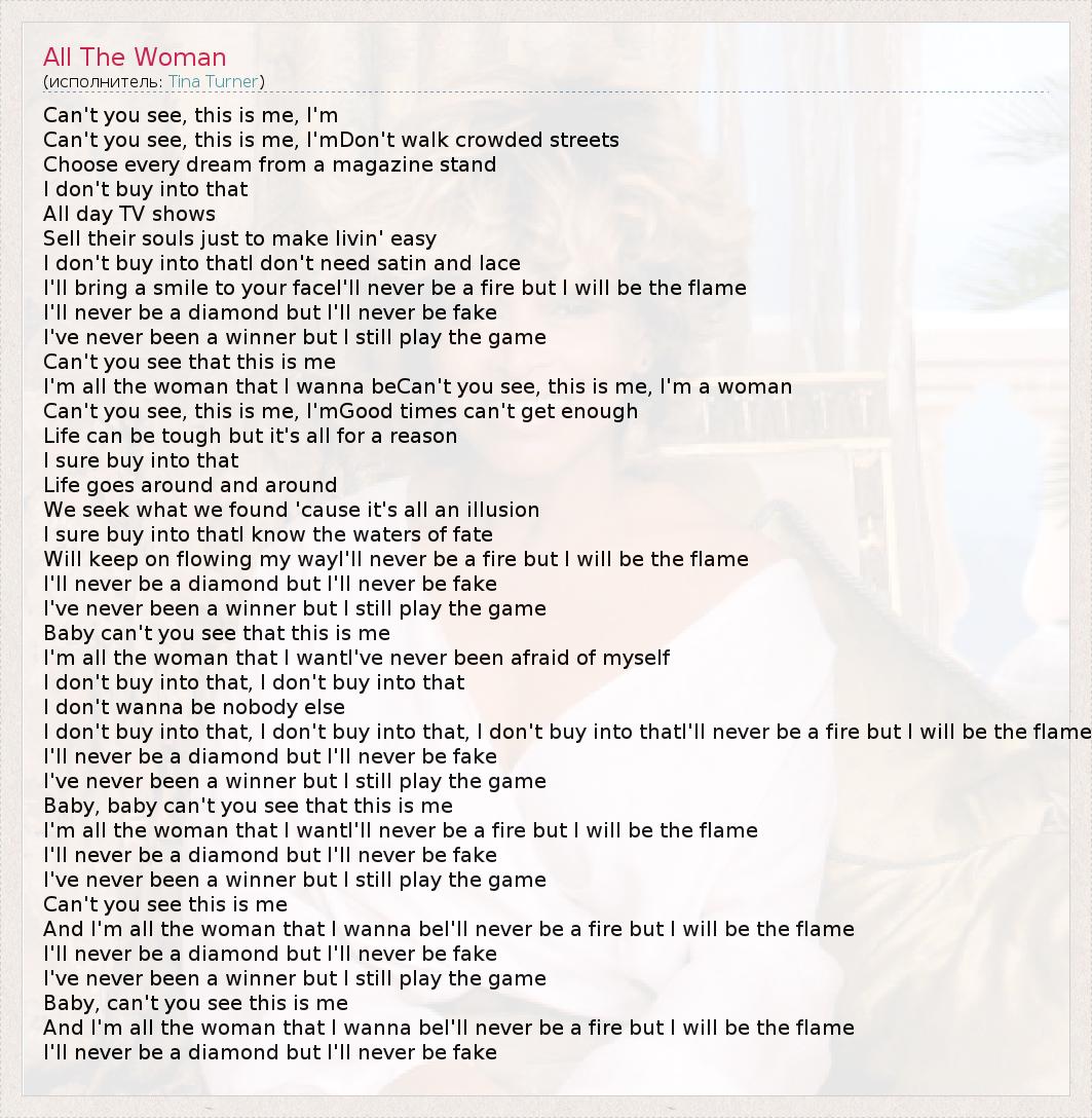 Can't you see, this is me, I'm Can't you see, this is me, I'mDon't walk crowded streets Choose every dream from a magazine stand I don't buy into that All day TV shows Sell their souls just to make livin' easy I don't buy into thatI don't need satin and lace I'll bring a smile to your faceI'll never be a fire but I will be the flame I'll never be a diamond but I'll never be fake I've never been a winner but I still play the game Can't you see that this is me I'm all the woman that I wanna beCan't you see, this is me, I'm a woman Can't you see, this is me, I'mGood times can't get enough Life can be tough but it's all for a reason I sure buy into that Life goes around and around We seek what we found 'cause it's all an illusion I sure buy into thatI know the waters of fate Will keep on flowing my wayI'll never be a fire but I will be the flame I'll never be a diamond but I'll never be fake I've never been a winner but I still play the game Baby can't you see that this is me I'm all the woman that I wantI've never been afraid of myself I don't buy into that, I don't buy into that I don't wanna be nobody else I don't buy into that, I don't buy into that, I don't buy into thatI'll never be a fire but I will be the flame I'll never be a diamond but I'll never be fake I've never been a winner but I still play the game Baby, baby can't you see that this is me I'm all the woman that I wantI'll never be a fire but I will be the flame I'll never be a diamond but I'll never be fake I've never been a winner but I still play the game Can't you see this is me And I'm all the woman that I wanna beI'll never be a fire but I will be the flame I'll never be a diamond but I'll never be fake I've never been a winner but I still play the game Baby, can't you see this is me And I'm all the woman that I wanna beI'll never be a fire but I will be the flame I'll never be a diamond but I'll never be fake