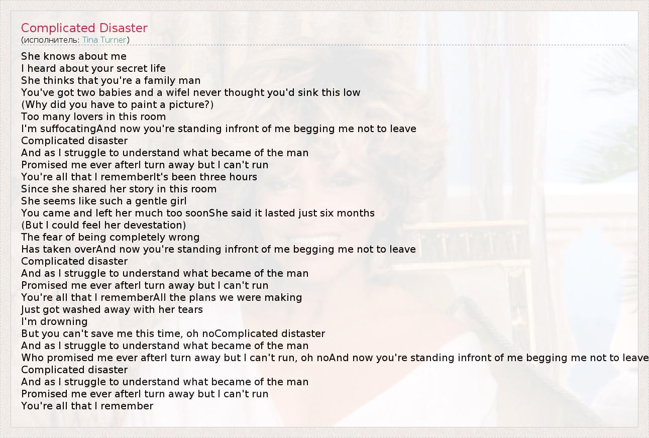 She knows about me I heard about your secret life She thinks that you're a family man You've got two babies and a wifeI never thought you'd sink this low (Why did you have to paint a picture?) Too many lovers in this room I'm suffocatingAnd now you're standing infront of me begging me not to leave Complicated disaster And as I struggle to understand what became of the man Promised me ever afterI turn away but I can't run You're all that I rememberIt's been three hours Since she shared her story in this room She seems like such a gentle girl You came and left her much too soonShe said it lasted just six months (But I could feel her devestation) The fear of being completely wrong Has taken overAnd now you're standing infront of me begging me not to leave Complicated disaster And as I struggle to understand what became of the man Promised me ever afterI turn away but I can't run You're all that I rememberAll the plans we were making Just got washed away with her tears I'm drowning But you can't save me this time, oh noComplicated distaster And as I struggle to understand what became of the man Who promised me ever afterI turn away but I can't run, oh noAnd now you're standing infront of me begging me not to leave Complicated disaster And as I struggle to understand what became of the man Promised me ever afterI turn away but I can't run You're all that I remember