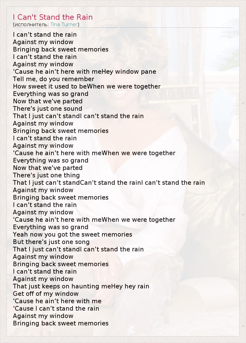 I can't stand the rain Against my window Bringing back sweet memories I can't stand the rain Against my window 'Cause he ain't here with meHey window pane Tell me, do you remember How sweet it used to beWhen we were together Everything was so grand Now that we've parted There's just one sound That I just can't standI can't stand the rain Against my window Bringing back sweet memories I can't stand the rain Against my window 'Cause he ain't here with meWhen we were together Everything was so grand Now that we've parted There's just one thing That I just can't standCan't stand the rainI can't stand the rain Against my window Bringing back sweet memories I can't stand the rain Against my window 'Cause he ain't here with meWhen we were together Everything was so grand Yeah now you got the sweet memories But there's just one song That I just can't standI can't stand the rain Against my window Bringing back sweet memories I can't stand the rain Against my window That just keeps on haunting meHey hey rain Get off of my window 'Cause he ain't here with me 'Cause I can't stand the rain Against my window Bringing back sweet memories