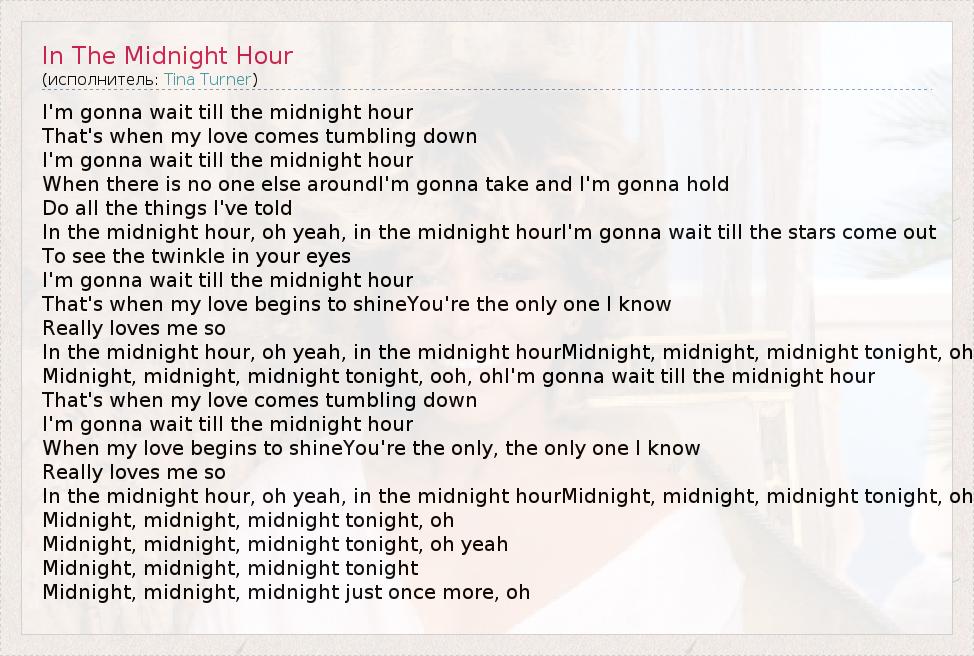 In the midnight hour, oh yeah, in the midnight hourMidnight, midnight, midnight tonight, oh