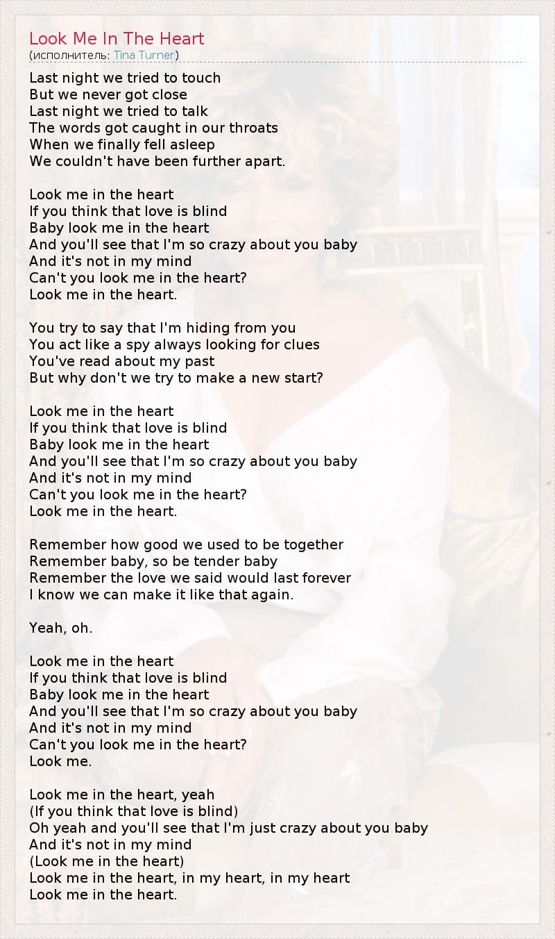 А как ты думаешь, о чем песня "Look Me In The Heart" ?