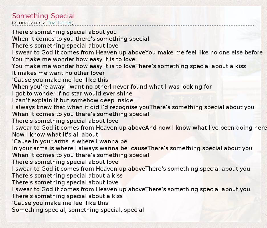 There's something special about you When it comes to you there's something special There's something special about love I swear to God it comes from Heaven up aboveYou make me feel like no one else before You make me wonder how easy it is to love You make me wonder how easy it is to loveThere's something special about a kiss It makes me want no other lover 'Cause you make me feel like this When you're away I want no otherI never found what I was looking for I got to wonder if no star would ever shine I can't explain it but somehow deep inside I always knew that when it did I'd recognise youThere's something special about you When it comes to you there's something special There's something special about love I swear to God it comes from Heaven up aboveAnd now I know what I've been doing here Now I know what it's all about 'Cause in your arms is where I wanna be In your arms is where I always wanna be 'causeThere's something special about you When it comes to you there's something special There's something special about love I swear to God it comes from Heaven up aboveThere's something special about you There's something special about a kiss There's something special about love I swear to God it comes from Heaven up aboveThere's something special about you There's something special about a kiss 'Cause you make me feel like this Something special, something special, special