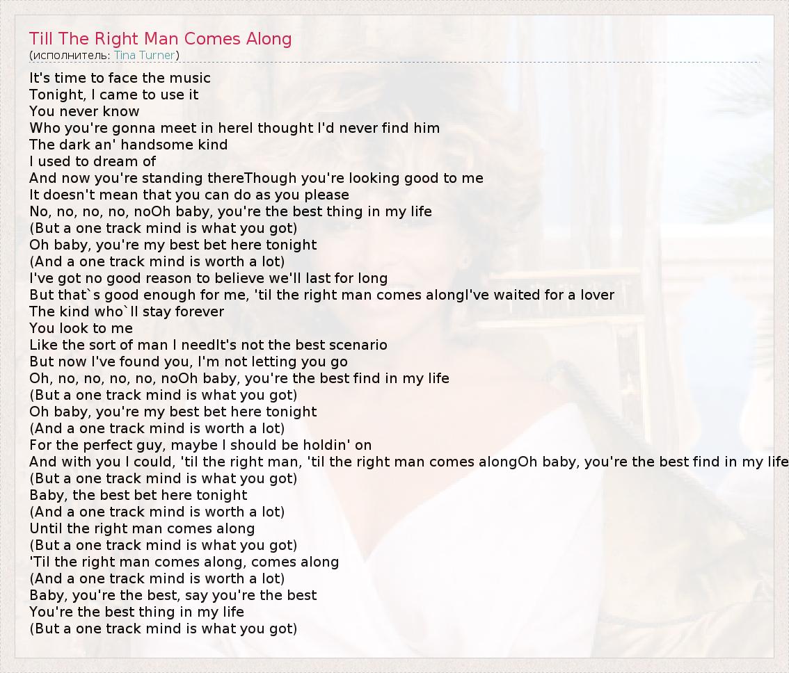 It's time to face the music Tonight, I came to use it You never know Who you're gonna meet in hereI thought I'd never find him The dark an' handsome kind I used to dream of And now you're standing thereThough you're looking good to me It doesn't mean that you can do as you please No, no, no, no, noOh baby, you're the best thing in my life (But a one track mind is what you got) Oh baby, you're my best bet here tonight (And a one track mind is worth a lot) I've got no good reason to believe we'll last for long But that`s good enough for me, 'til the right man comes alongI've waited for a lover The kind who`ll stay forever You look to me Like the sort of man I needIt's not the best scenario But now I've found you, I'm not letting you go Oh, no, no, no, no, noOh baby, you're the best find in my life (But a one track mind is what you got) Oh baby, you're my best bet here tonight (And a one track mind is worth a lot) For the perfect guy, maybe I should be holdin' on And with you I could, 'til the right man, 'til the right man comes alongOh baby, you're the best find in my life (But a one track mind is what you got) Baby, the best bet here tonight (And a one track mind is worth a lot) Until the right man comes along (But a one track mind is what you got) 'Til the right man comes along, comes along (And a one track mind is worth a lot) Baby, you're the best, say you're the best You're the best thing in my life (But a one track mind is what you got)