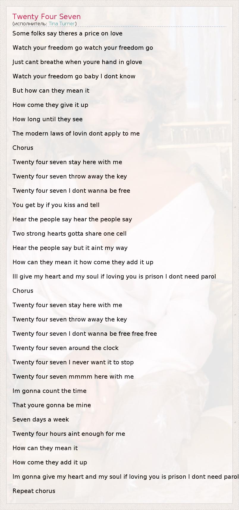 Some folks say theres a price on love Watch your freedom go watch your freedom go Just cant breathe when youre hand in glove Watch your freedom go baby I dont know But how can they mean it How come they give it up How long until they see The modern laws of lovin dont apply to me Chorus Twenty four seven stay here with me Twenty four seven throw away the key Twenty four seven I dont wanna be free You get by if you kiss and tell Hear the people say hear the people say Two strong hearts gotta share one cell Hear the people say but it aint my way How can they mean it how come they add it up Ill give my heart and my soul if loving you is prison I dont need parol Chorus Twenty four seven stay here with me Twenty four seven throw away the key Twenty four seven I dont wanna be free free free Twenty four seven around the clock Twenty four seven I never want it to stop Twenty four seven mmmm here with me Im gonna count the time That youre gonna be mine Seven days a week Twenty four hours aint enough for me How can they mean it How come they add it up Im gonna give my heart and my soul if loving you is prison I dont need parol Repeat chorus