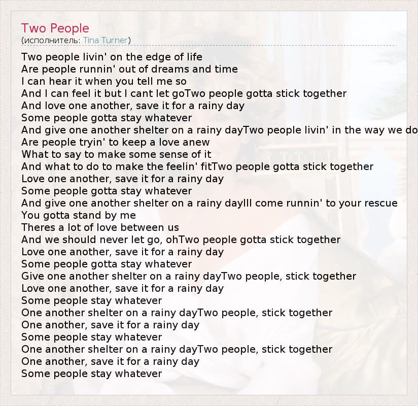 And give one another shelter on a rainy dayTwo people livin' in the way we do