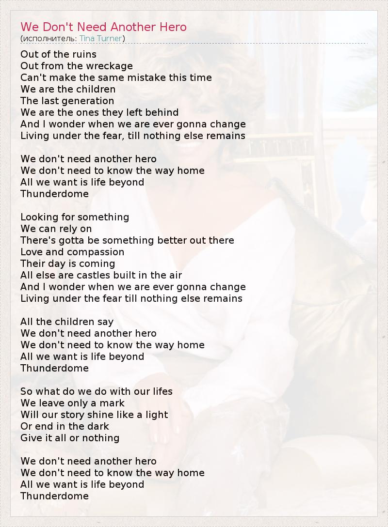 Мы не нуждаемся в очередном герое (Перевод AdelinaM&Bonikid) За руинами, У обломков прошлого Нельзя совершать ту же ошибку и на сей раз. Мы дети, Мы новое поколение, Мы те, кто принял эстафету. И я хочу знать, когда мы перестанем Жить под страхом, до каких пор это будет продолжаться. Мы не нуждаемся в очередном герое, Нам незачем знать, где можно укрыться, Всё, что мы хотим - жить вдали от грозового купола. Мы в поисках большего, на что можно опереться. Должно быть нечто более надёжное- Любовь и сострадание, Грядёт их черёд. Всё остальное – воздушные замки. И я хочу знать, когда мы перестанем Жить под страхом, до каких пор это будет продолжаться. Дети заявляют – Мы не нуждаемся в очередном герое. Нам незачем знать, где можно укрыться. Всё, что мы хотим – жить подальше от грозового купола. Так чем же заполнить наши жизни? Только от нас зависит- Будет ли история ярко светить Или угаснет в темноте… Всё или ничего… Мы не нуждаемся в очередном герое, Нам незачем знать, где можно укрыться, Всё, что мы хотим - жить вдали от грозового купола!