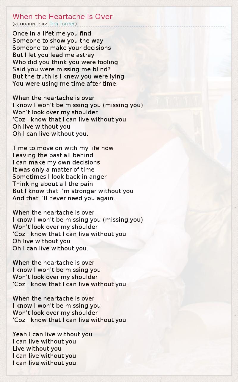 Once in a lifetime you find Someone to show you the way Someone to make your decisions But I let you lead me astray Who did you think you were fooling Said you were missing me blind? But the truth is I knew you were lying You were using me time after time. When the heartache is over I know I won't be missing you (missing you) Won't look over my shoulder 'Coz I know that I can live without you Oh live without you Oh I can live without you. Time to move on with my life now Leaving the past all behind I can make my own decisions It was only a matter of time Sometimes I look back in anger Thinking about all the pain But I know that I'm stronger without you And that I'll never need you again. When the heartache is over I know I won't be missing you (missing you) Won't look over my shoulder 'Coz I know that I can live without you Oh live without you Oh I can live without you. When the heartache is over I know I won't be missing you Won't look over my shoulder 'Coz I know that I can live without you. When the heartache is over I know I won't be missing you Won't look over my shoulder 'Coz I know that I can live without you. Yeah I can live without you I can live without you Live without you I can live without you I can live without you.