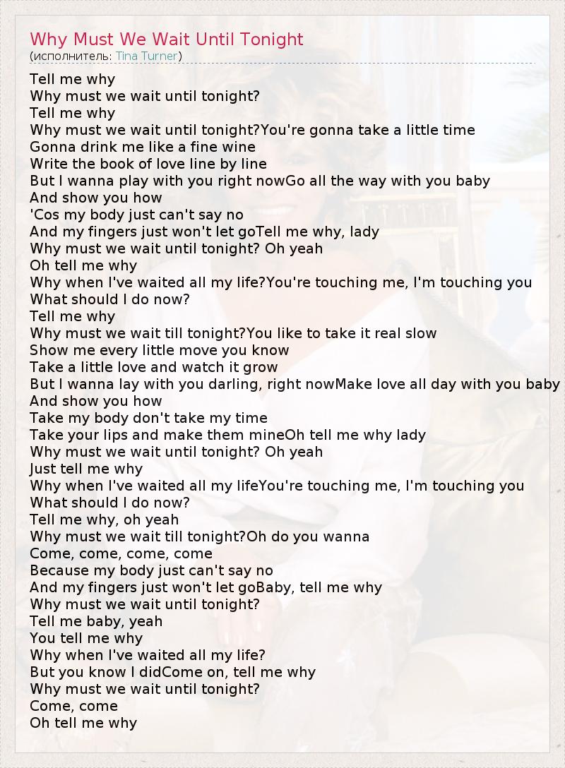 Tell me why Why must we wait until tonight? Tell me why Why must we wait until tonight?You're gonna take a little time Gonna drink me like a fine wine Write the book of love line by line But I wanna play with you right nowGo all the way with you baby And show you how 'Cos my body just can't say no And my fingers just won't let goTell me why, lady Why must we wait until tonight? Oh yeah Oh tell me why Why when I've waited all my life?You're touching me, I'm touching you What should I do now? Tell me why Why must we wait till tonight?You like to take it real slow Show me every little move you know Take a little love and watch it grow But I wanna lay with you darling, right nowMake love all day with you baby And show you how Take my body don't take my time Take your lips and make them mineOh tell me why lady Why must we wait until tonight? Oh yeah Just tell me why Why when I've waited all my lifeYou're touching me, I'm touching you What should I do now? Tell me why, oh yeah Why must we wait till tonight?Oh do you wanna Come, come, come, come Because my body just can't say no And my fingers just won't let goBaby, tell me why Why must we wait until tonight? Tell me baby, yeah You tell me why Why when I've waited all my life? But you know I didCome on, tell me why Why must we wait until tonight? Come, come Oh tell me why