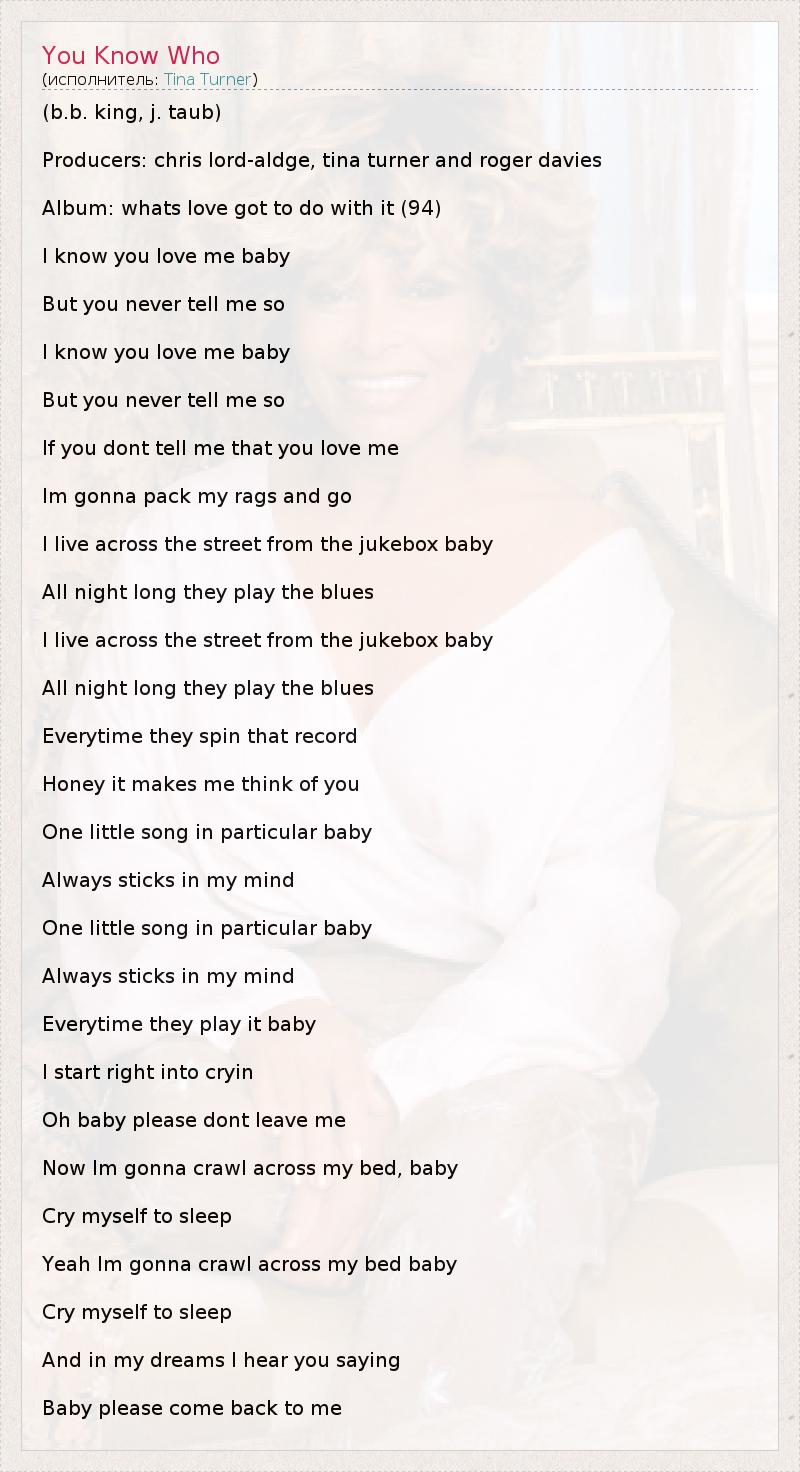 (b.b. king, j. taub) Producers: chris lord-aldge, tina turner and roger davies Album: whats love got to do with it (94) I know you love me baby But you never tell me so I know you love me baby But you never tell me so If you dont tell me that you love me Im gonna pack my rags and go I live across the street from the jukebox baby All night long they play the blues I live across the street from the jukebox baby All night long they play the blues Everytime they spin that record Honey it makes me think of you One little song in particular baby Always sticks in my mind One little song in particular baby Always sticks in my mind Everytime they play it baby I start right into cryin Oh baby please dont leave me Now Im gonna crawl across my bed, baby Cry myself to sleep Yeah Im gonna crawl across my bed baby Cry myself to sleep And in my dreams I hear you saying Baby please come back to me