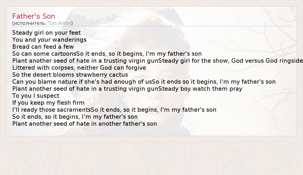 Steady girl on your feet You and your wanderings Bread can feed a few So can some cartoonsSo it ends, so it begins, I'm my father's son Plant another seed of hate in a trusting virgin gunSteady girl for the show, God versus God ringside Littered with corpses, neither God can forgive So the desert blooms strawberry cactus Can you blame nature if she's had enough of usSo it ends so it begins, I'm my father's son Plant another seed of hate in a trusting virgin gunSteady boy watch them pray To you I suspect If you keep my flesh firm I'll ready those sacramentsSo it ends, so it begins, I'm my father's son So it ends, so it begins, I'm my father's son Plant another seed of hate in another father's son