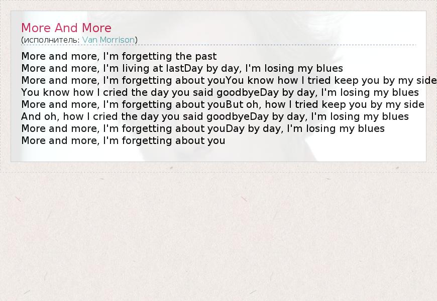 More and more, I'm forgetting about youDay by day, I'm losing my blues