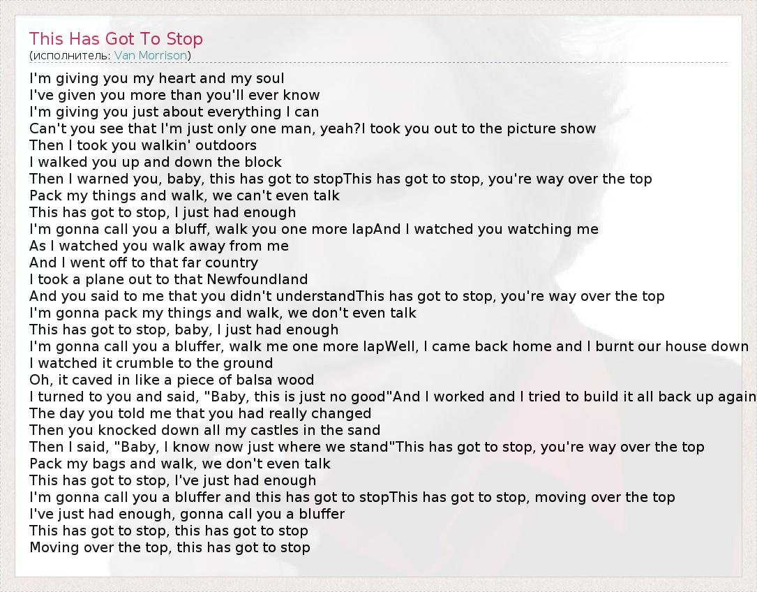Then I warned you, baby, this has got to stopThis has got to stop, you're way over the top