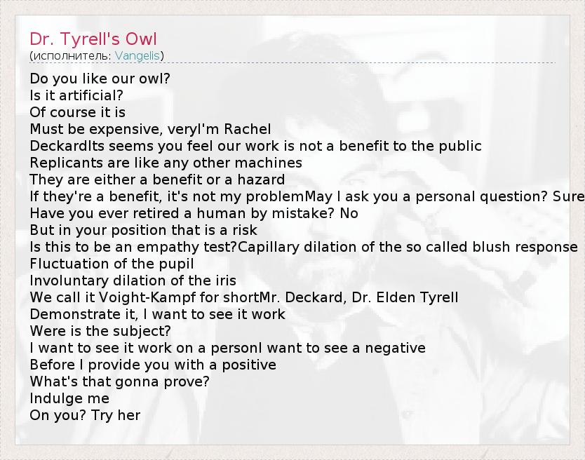А как ты думаешь, о чем песня "Dr. Tyrell's Owl" ?