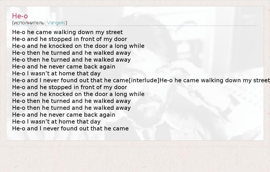 He-o and I never found out that he came[interlude]He-o he came walking down my street