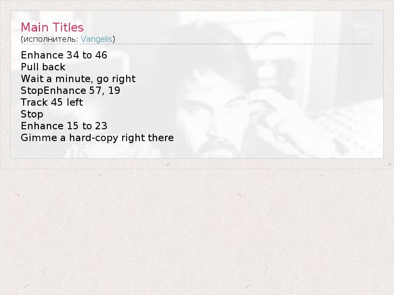 Это интересно:Вангелис (Vangelis) - композитор и исполнитель электронной музыки с мировым именем. Его настоящее имя - Евангелос Одиссеас Папатанассиу (Evangelos Odysseas Papathanassiou). Он родился 29 марта 1943 года в греческом городе Волос (Volos).Самые его известные композиции - тема из фильма "Колесницы огня" (Chariots of Fire), получившая в 1981 году премию Американской киноакадемии "Оскар"; саундтрек к фильму "Бегущий... продолжение