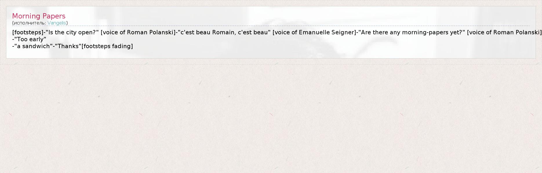 [footsteps]-"Is the city open?" [voice of Roman Polanski]-"c'est beau Romain, c'est beau" [voice of Emanuelle Seigner]-"Are there any morning-papers yet?" [voice of Roman Polanski] -"Too early" -"a sandwich"-"Thanks"[footsteps fading]