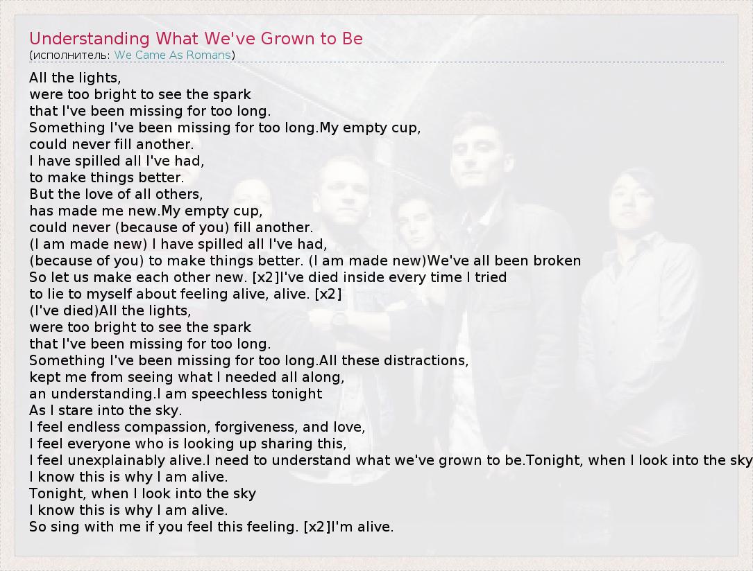 All the lights, were too bright to see the spark that I've been missing for too long. Something I've been missing for too long.My empty cup, could never fill another. I have spilled all I've had, to make things better. But the love of all others, has made me new.My empty cup, could never (because of you) fill another. (I am made new) I have spilled all I've had, (because of you) to make things better. (I am made new)We've all been broken So let us make each other new. [x2]I've died inside every time I tried to lie to myself about feeling alive, alive. [x2] (I've died)All the lights, were too bright to see the spark that I've been missing for too long. Something I've been missing for too long.All these distractions, kept me from seeing what I needed all along, an understanding.I am speechless tonight As I stare into the sky. I feel endless compassion, forgiveness, and love, I feel everyone who is looking up sharing this, I feel unexplainably alive.I need to understand what we've grown to be.Tonight, when I look into the sky I know this is why I am alive. Tonight, when I look into the sky I know this is why I am alive. So sing with me if you feel this feeling. [x2]I'm alive.