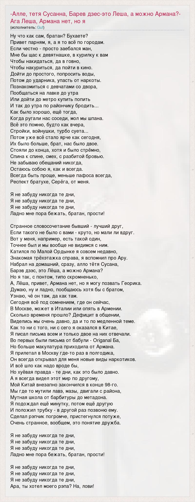 Ну что как сам, братан? Бухаете? Привет парням, я, а я то всё по городам. Если честно - просто заебался ман, Мне бы щас к девятнашке, в курилку к вам Чтобы накидаться, да в говно, Чтобы накуриться, да пойти в кино. Дойти до простого, попросить воды, Потом до ударника, упасть от наркоты. Познакомиться с девчатами со двора, Пообщаться на лавке до утра Или дойти до метро купить попить И так до утра по райончику бродить... Как было хорошо, ещё тогда, Когда ругали нас соседи, мол мы шпана. Всё это помню, будто как вчера, Стройки, войнушки, турбо суета... Потом уже всё стало ярче как сегодня, Их было больше, брат, нас было двое. Стояли до конца, хотя и было стрёмно, Спина к спине, смех, с разбитой бровью. Не забываю обещаний никогда, Остаюсь собою я, как и всегда. Всегда быть проще, меньше пафоса всегда, Респект братухе, Серёга, от меня. Я не забуду никогда те дни, Я не забуду никогда те дни, Я не забуду никогда те дни, Ладно мне пора бежать, братан, прости! Странное словосочетание бывший - лучший друг, Если такого не было с вами - круто, но мали ли вдруг. Вот у меня, например, есть такой один, Точнее был и мы вообще не видимся с ним. Катился по Малой Ордынке я совсем недавно, Знакомая трёхэтажка справа, я вспомнил про Ару. Набрал на домашний, сразу, алло тётя Сусана, Барэв дзэс, это Лёша, а можно Армана? Но я так, с понтом, типо скромненько, А, Лёша, привет, Армана нет, но я могу позвать Георика. Думаю, ну и ладно, пообщаюсь хотя бы с братом, Узнаю, чё он там, да как там. Сегодня всё под сомнением, где он сейчас, В Москве, может в Италии или опять в Армении. Сколько временя прошло? Дефицит в общении, Виделись мы очень давно, да и то по медленной теме. Как то ни с того, ни с сего я оказался в Китае, Я писал письма всем и только двое на них отвечали. Во первых были письма от бабули - Origanal Ба, Но больше макулатура приходила от Армана. Я прилетал в Москву где-то раз в полгодика, Он всегда открывал для меня новые виды наркотиков. И всё шло как надо вроде бы, Но хуёвая правда - те дни, как это было давно. А я всегда видел этот мир по другому, Мой Китай внезапно закончился в конце 98-го. Мы где то мутили лавэ, мазы, двигали с района, Мутная школа от барбитуры до метадона. Я подождал ещё минутку, потом ещё другую И положил трубку - в другой раз позвоню ему. Сделал рэпчик погромче, пристегнулся потуже, Очень странное, вообщем, это понятие дружба. Я не забуду никогда те дни, Я не забуду никогда те дни, Я не забуду никогда те дни, Ладно мне пора бежать, братан, прости! Я не забуду никогда те дни, Я не забуду никогда те дни, Я не забуду никогда те дни, Ара, ты хотел моего рэпа? На, лови!