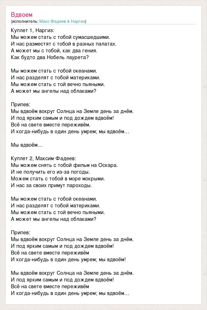 Куплет 1, Наргиз: Мы можем стать с тобой сумасшедшими. И нас разместят с тобой в разных палатах. А может мы с тобой, как два гения. Как будто два Нобель лаурета? Мы можем стать с тобой океанами. И нас разделят с тобой материками. Мы можем стать с той вечно пьяными. А может мы ангелы над облаками? Припев: Мы вдвоём вокруг Солнца на Земле день за днём. И под ярким самым и под дождем вдвоём! Всё на свете вместе переживём. И когда-нибудь в один день умрем; мы вдвоём… Мы вдвоём… Куплет 2, Максим Фадеев: Мы можем снять с тобой фильм на Оскара. И не получить его из-за погоды. Можем стать с тобой в море мокрыми. И нас за своих примут пароходы. Мы можем стать с тобой океанами. И нас разделят с тобой материками. Мы можем стать с той вечно пьяными. А может мы ангелы над облаками? Припев: Мы вдвоём вокруг Солнца на Земле день за днём. И под ярким самым и под дождем вдвоём! Всё на свете вместе переживём И когда-нибудь в один день умрем; мы вдвоём! Мы вдвоём вокруг Солнца на Земле день за днём. И под ярким самым и под дождем вдвоём! Всё на свете вместе переживём И когда-нибудь в один день умрем; мы вдвоём…