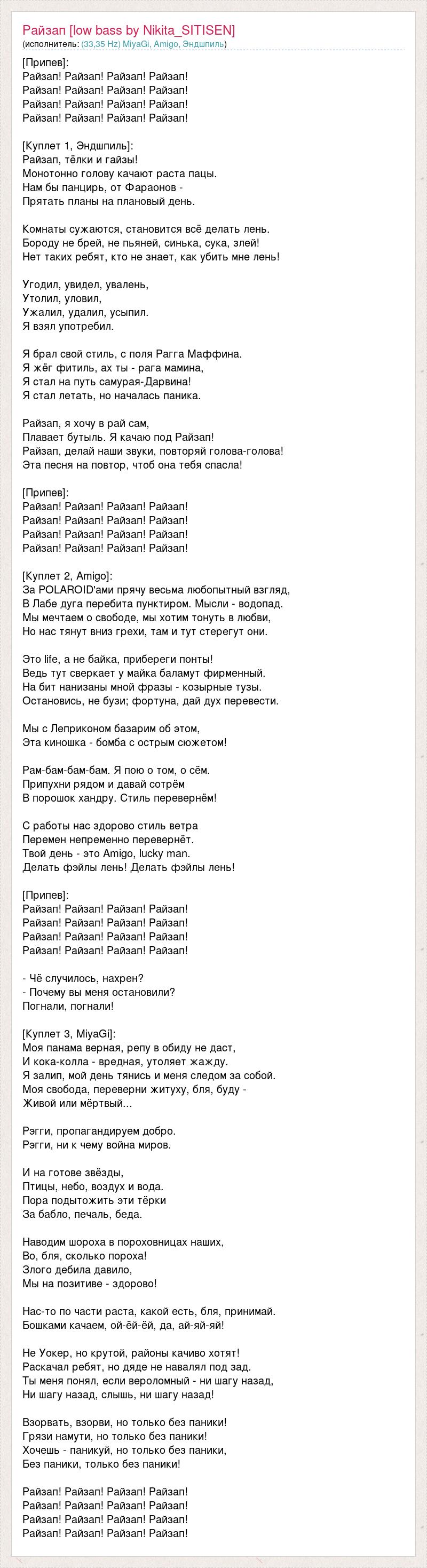 [Припев]: Райзап! Райзап! Райзап! Райзап! Райзап! Райзап! Райзап! Райзап! Райзап! Райзап! Райзап! Райзап! Райзап! Райзап! Райзап! Райзап! [Куплет 1, Эндшпиль]: Райзап, тёлки и гайзы! Монотонно голову качают раста пацы. Нам бы панцирь, от Фараонов - Прятать планы на плановый день. Комнаты сужаются, становится всё делать лень. Бороду не брей, не пьяней, синька, сука, злей! Нет таких ребят, кто не знает, как убить мне лень! Угодил, увидел, увалень, Утолил, уловил, Ужалил, удалил, усыпил. Я взял употребил. Я брал свой стиль, с поля Рагга Маффина. Я жёг фитиль, ах ты - рага мамина, Я стал на путь самурая-Дарвина! Я стал летать, но началась паника. Райзап, я хочу в рай сам, Плавает бутыль. Я качаю под Райзап! Райзап, делай наши звуки, повторяй голова-голова! Эта песня на повтор, чтоб она тебя спасла! [Припев]: Райзап! Райзап! Райзап! Райзап! Райзап! Райзап! Райзап! Райзап! Райзап! Райзап! Райзап! Райзап! Райзап! Райзап! Райзап! Райзап! [Куплет 2, Amigo]: За POLAROID'ами прячу весьма любопытный взгляд, В Лабе дуга перебита пунктиром. Мысли - водопад. Мы мечтаем о свободе, мы хотим тонуть в любви, Но нас тянут вниз грехи, там и тут стерегут они. Это life, а не байка, прибереги понты! Ведь тут сверкает у майка баламут фирменный. На бит нанизаны мной фразы - козырные тузы. Остановись, не бузи; фортуна, дай дух перевести. Мы с Леприконом базарим об этом, Эта киношка - бомба с острым сюжетом! Рам-бам-бам-бам. Я пою о том, о сём. Припухни рядом и давай сотрём В порошок хандру. Стиль перевернём! С работы нас здорово стиль ветра Перемен непременно перевернёт. Твой день - это Amigo, lucky man. Делать фэйлы лень! Делать фэйлы лень! [Припев]: Райзап! Райзап! Райзап! Райзап! Райзап! Райзап! Райзап! Райзап! Райзап! Райзап! Райзап! Райзап! Райзап! Райзап! Райзап! Райзап! - Чё случилось, нахрен? - Почему вы меня остановили? Погнали, погнали! [Куплет 3, MiyaGi]: Моя панама верная, репу в обиду не даст, И кока-колла - вредная, утоляет жажду. Я залип, мой день тянись и меня следом за собой. Моя свобода, переверни житуху, бля, буду - Живой или мёртвый... Рэгги, пропагандируем добро. Рэгги, ни к чему война миров. И на готове звёзды, Птицы, небо, воздух и вода. Пора подытожить эти тёрки За бабло, печаль, беда. Наводим шороха в пороховницах наших, Во, бля, сколько пороха! Злого дебила давило, Мы на позитиве - здорово! Нас-то по части раста, какой есть, бля, принимай. Бошками качаем, ой-ёй-ёй, да, ай-яй-яй! Не Уокер, но крутой, районы качиво хотят! Раскачал ребят, но дяде не навалял под зад. Ты меня понял, если вероломный - ни шагу назад, Ни шагу назад, слышь, ни шагу назад! Взорвать, взорви, но только без паники! Грязи намути, но только без паники! Хочешь - паникуй, но только без паники, Без паники, только без паники! Райзап! Райзап! Райзап! Райзап! Райзап! Райзап! Райзап! Райзап! Райзап! Райзап! Райзап! Райзап! Райзап! Райзап! Райзап! Райзап!