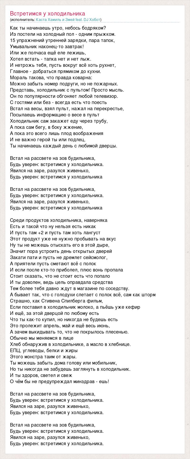 Как ты начинаешь утро, небось бодряком? Из постели на холодный пол - одним прыжком. 15 упражнений утренней зарядки, пара тапок, Умывальник наконец-то завтрак! Или же полчаса ещё еле лежишь, Хотел встать - тапка нет и нет лыж. И нетрожь тебя, пусть вокруг всё хоть рухнет, Главное - добраться прямиком до кухни. Мораль такова, что правда коварна: Можно забыть номер подруги, но не пожарных. Представь, холодильник с пультом! Просто мысль. Он по популярности обгоняет любой телевизор. С гостями или без - всегда есть что поесть Встал на весы, взял пульт, нажал на перекрестье, Посылаешь информацию о весе в пульт Холодильник сам закажет еду через трубу, А пока сам бегу, в боку жжение, А пока это всего лишь плод воображения И не важно герой ты или подлец, Ты начинаешь каждый день с любимой дверцы. Встал на рассвете на зов будильника, Будь уверен: встретимся у холодильника. Явился на заре, разулся живенько, Будь уверен: встретимся у холодильника Встал на рассвете на зов будильника, Будь уверен: встретимся у холодильника. Явился на заре, разулся живенько, Будь уверен: встретимся у холодильника Среди продуктов холодильника, наверняка Есть и такой что ну нельзя есть никак И пусть там +2 и пусть там хоть лангуст Этот продукт уже не нужно пробывать на вкус Ну ты не можешь отыскать его в этой дыре, Значит пора устроить день открытых дверей Закати пати и пусть не дремлет сейсмолог, А приятели пусть сметают всё с полок И если после кто-то приболел, плюс вонь пропала Стоит сказать, что не стоит есть что попало И ты доволен, ведь цель оправдала средства Тем более тебя давно ждут в магазине по соседству. А бывает так, что с голодухи слетает с полок всё, сам как шторм Страшно, как Стивена Спилберга фильм, Если поставил в холодильник молоко, а пьёшь уже кефир И ещё, за этой дверцой по любому есть Что ты как-то купил, но никогда не будешь есть Это пролежит апрель, май и ещё весь июнь, А зачем выкидывать то, что не покрылось плесенью. Обычно мы меняемся в лице Хлеб обнаружив в холодильнике, а масло в хлебнице. ЕПЦ, углеводы, белки и жиры Этого монстра таим от жары. Ты можешь забыть дома голову или мобильник, Но ты никогда не забудешь заглянуть в холодильник. И ты здоров, светел и свеж О чём бы не предупреждал минздрав - ешь! Встал на рассвете на зов будильника, Будь уверен: встретимся у холодильника. Явился на заре, разулся живенько, Будь уверен: встретимся у холодильника. Встал на рассвете на зов будильника, Будь уверен: встретимся у холодильника. Явился на заре, разулся живенько, Будь уверен: встретимся у холодильника.