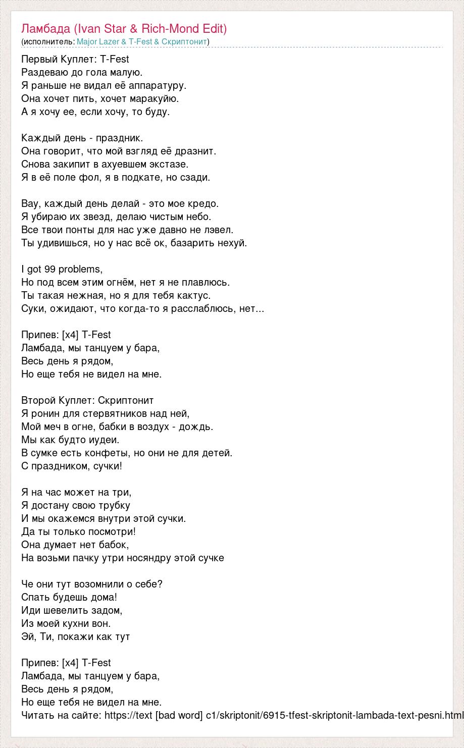 Первый Куплет: T-Fest Раздеваю до гола малую. Я раньше не видал её аппаратуру. Она хочет пить, хочет маракуйю. А я хочу ее, если хочу, то буду. Каждый день - праздник. Она говорит, что мой взгляд её дразнит. Снова закипит в ахуевшем экстазе. Я в её поле фол, я в подкате, но сзади. Вау, каждый день делай - это мое кредо. Я убираю их звезд, делаю чистым небо. Все твои понты для нас уже давно не лэвел. Ты удивишься, но у нас всё ок, базарить нехуй. I got 99 problems, Но под всем этим огнём, нет я не плавлюсь. Ты такая нежная, но я для тебя кактус. Суки, ожидают, что когда-то я расслаблюсь, нет... Припев: [x4] T-Fest Ламбада, мы танцуем у бара, Весь день я рядом, Но еще тебя не видел на мне. Второй Куплет: Скриптонит Я ронин для стервятников над ней, Мой меч в огне, бабки в воздух - дождь. Мы как будто иудеи. В сумке есть конфеты, но они не для детей. С праздником, сучки! Я на час может на три, Я достану свою трубку И мы окажемся внутри этой сучки. Да ты только посмотри! Она думает нет бабок, На возьми пачку утри носяндру этой сучке Че они тут возомнили о себе? Спать будешь дома! Иди шевелить задом, Из моей кухни вон. Эй, Ти, покажи как тут Припев: [x4] T-Fest Ламбада, мы танцуем у бара, Весь день я рядом, Но еще тебя не видел на мне. Читать на сайте: https://text [bad word] c1/skriptonit/6915-tfest-skriptonit-lambada-text-pesni.html