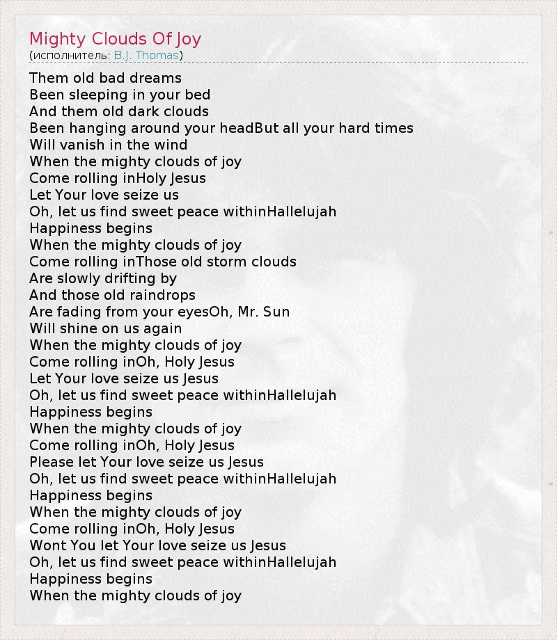 Them old bad dreams Been sleeping in your bed And them old dark clouds Been hanging around your headBut all your hard times Will vanish in the wind When the mighty clouds of joy Come rolling inHoly Jesus Let Your love seize us Oh, let us find sweet peace withinHallelujah Happiness begins When the mighty clouds of joy Come rolling inThose old storm clouds Are slowly drifting by And those old raindrops Are fading from your eyesOh, Mr. Sun Will shine on us again When the mighty clouds of joy Come rolling inOh, Holy Jesus Let Your love seize us Jesus Oh, let us find sweet peace withinHallelujah Happiness begins When the mighty clouds of joy Come rolling inOh, Holy Jesus Please let Your love seize us Jesus Oh, let us find sweet peace withinHallelujah Happiness begins When the mighty clouds of joy Come rolling inOh, Holy Jesus Wont You let Your love seize us Jesus Oh, let us find sweet peace withinHallelujah Happiness begins When the mighty clouds of joy