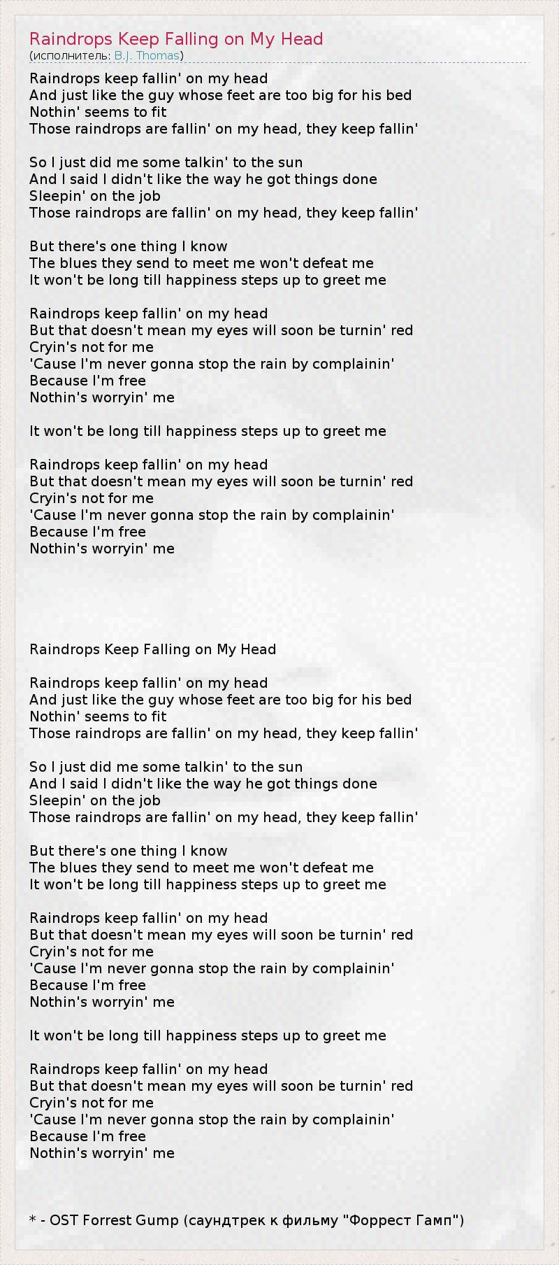 А как ты думаешь, о чем песня "Raindrops Keep Falling on My Head" ?