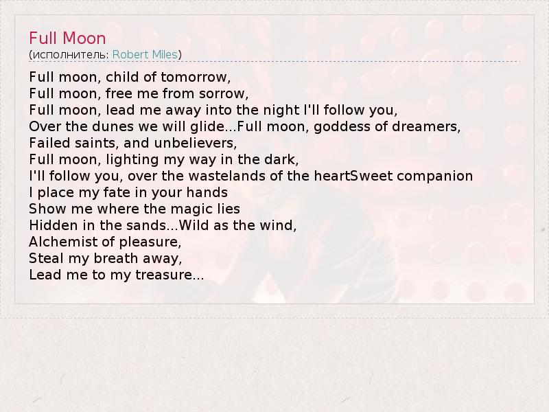 Это интересно:Роберт Майлз (настоящее имя - Роберто Кончина (Roberto Concina)) родился 3 ноября 1969 г. в г. Невшатель, Швейцария. Майлз - ди-джей и композитор, работающий в различных стилях электронной музыки, популяризатор стиля Dreamhouse (очень многие даже ошибочно считают его основателем стиля).С детских лет он занимался игрой на фортепиано, хотя и не проявлял к этому особого интереса. Интерес к музыке возник... продолжение