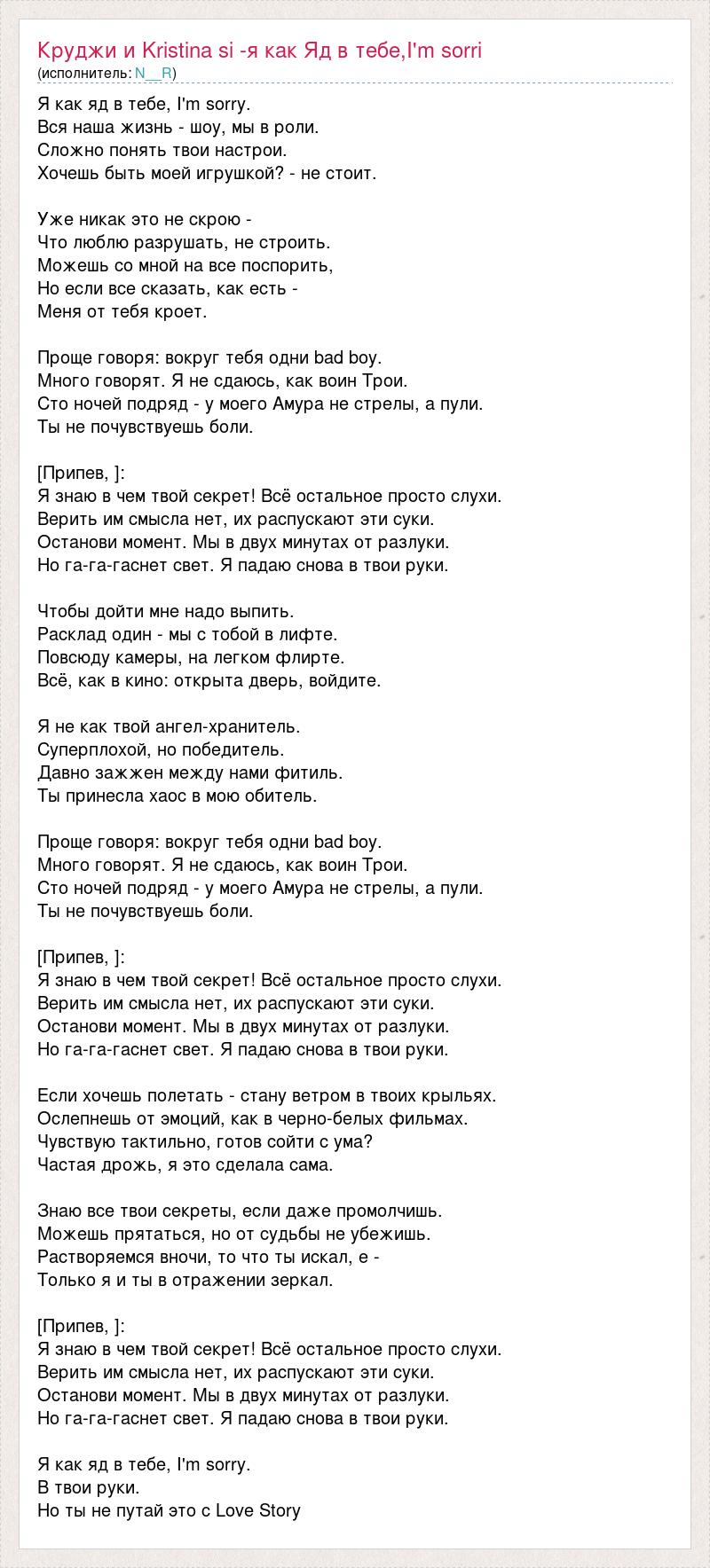 Я как яд в тебе, I'm sorry. Вся наша жизнь - шоу, мы в роли. Сложно понять твои настрои. Хочешь быть моей игрушкой? - не стоит. Уже никак это не скрою - Что люблю разрушать, не строить. Можешь со мной на все поспорить, Но если все сказать, как есть - Меня от тебя кроет. Проще говоря: вокруг тебя одни bad boy. Много говорят. Я не сдаюсь, как воин Трои. Сто ночей подряд - у моего Амура не стрелы, а пули. Ты не почувствуешь боли. [Припев, ]: Я знаю в чем твой секрет! Всё остальное просто слухи. Верить им смысла нет, их распускают эти суки. Останови момент. Мы в двух минутах от разлуки. Но га-га-гаснет свет. Я падаю снова в твои руки. Чтобы дойти мне надо выпить. Расклад один - мы с тобой в лифте. Повсюду камеры, на легком флирте. Всё, как в кино: открыта дверь, войдите. Я не как твой ангел-хранитель. Суперплохой, но победитель. Давно зажжен между нами фитиль. Ты принесла хаос в мою обитель. Проще говоря: вокруг тебя одни bad boy. Много говорят. Я не сдаюсь, как воин Трои. Сто ночей подряд - у моего Амура не стрелы, а пули. Ты не почувствуешь боли. [Припев, ]: Я знаю в чем твой секрет! Всё остальное просто слухи. Верить им смысла нет, их распускают эти суки. Останови момент. Мы в двух минутах от разлуки. Но га-га-гаснет свет. Я падаю снова в твои руки. Если хочешь полетать - стану ветром в твоих крыльях. Ослепнешь от эмоций, как в черно-белых фильмах. Чувствую тактильно, готов сойти с ума? Частая дрожь, я это сделала сама. Знаю все твои секреты, если даже промолчишь. Можешь прятаться, но от судьбы не убежишь. Растворяемся вночи, то что ты искал, е - Только я и ты в отражении зеркал. [Припев, ]: Я знаю в чем твой секрет! Всё остальное просто слухи. Верить им смысла нет, их распускают эти суки. Останови момент. Мы в двух минутах от разлуки. Но га-га-гаснет свет. Я падаю снова в твои руки. Я как яд в тебе, I'm sorry. В твои руки. Но ты не путай это с Love Story