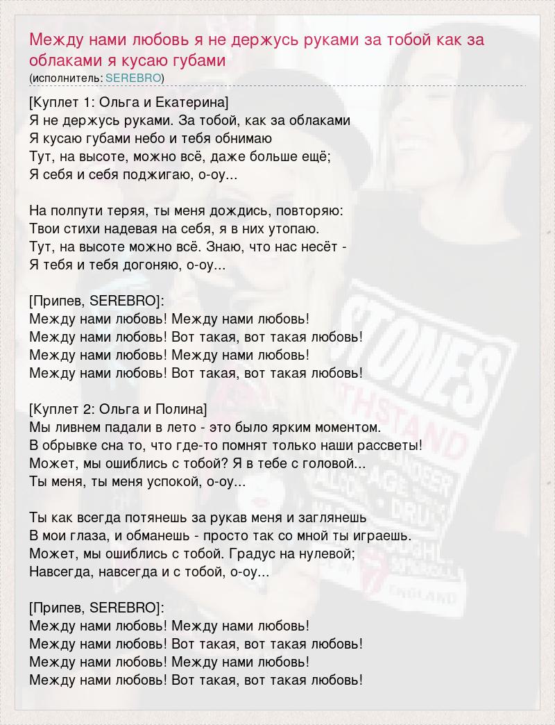 [Куплет 1: Ольга и Екатерина] Я не держусь руками. За тобой, как за облаками Я кусаю губами небо и тебя обнимаю Тут, на высоте, можно всё, даже больше ещё; Я себя и себя поджигаю, о-оу... На полпути теряя, ты меня дождись, повторяю: Твои стихи надевая на себя, я в них утопаю. Тут, на высоте можно всё. Знаю, что нас несёт - Я тебя и тебя догоняю, о-оу... [Припев, SEREBRO]: Между нами любовь! Между нами любовь! Между нами любовь! Вот такая, вот такая любовь! Между нами любовь! Между нами любовь! Между нами любовь! Вот такая, вот такая любовь! [Куплет 2: Ольга и Полина] Мы ливнем падали в лето - это было ярким моментом. В обрывке сна то, что где-то помнят только наши рассветы! Может, мы ошиблись с тобой? Я в тебе с головой... Ты меня, ты меня успокой, о-оу... Ты как всегда потянешь за рукав меня и заглянешь В мои глаза, и обманешь - просто так со мной ты играешь. Может, мы ошиблись с тобой. Градус на нулевой; Навсегда, навсегда и с тобой, о-оу... [Припев, SEREBRO]: Между нами любовь! Между нами любовь! Между нами любовь! Вот такая, вот такая любовь! Между нами любовь! Между нами любовь! Между нами любовь! Вот такая, вот такая любовь!