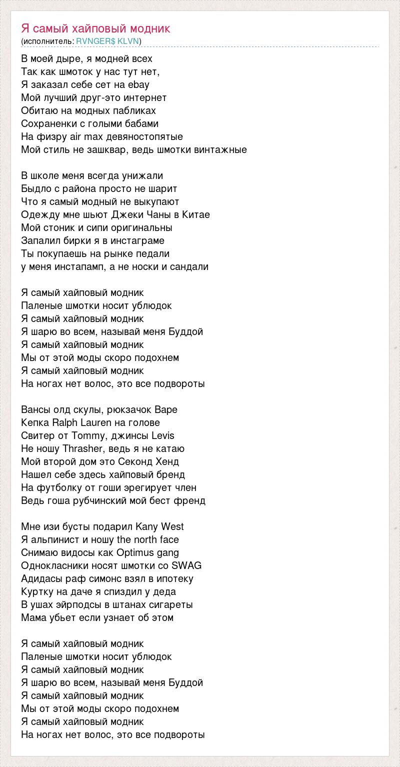 В моей дыре, я модней всех Так как шмоток у нас тут нет, Я заказал себе сет на ebay Мой лучший друг-это интернет Обитаю на модных пабликах Сохраненки с голыми бабами На физру air max девяностопятые Мой стиль не зашквар, ведь шмотки винтажные В школе меня всегда унижали Быдло с района просто не шарит Что я самый модный не выкупают Одежду мне шьют Джеки Чаны в Китае Мой стоник и сипи оригинальны Запалил бирки я в инстаграме Ты покупаешь на рынке педали у меня инстапамп, а не носки и сандали Я самый хайповый модник Паленые шмотки носит ублюдок Я самый хайповый модник Я шарю во всем, называй меня Буддой Я самый хайповый модник Мы от этой моды скоро подохнем Я самый хайповый модник На ногах нет волос, это все подвороты Вансы олд скулы, рюкзачок Bape Кепка Ralph Lauren на голове Свитер от Tommy, джинсы Levis Не ношу Thrasher, ведь я не катаю Мой второй дом это Секонд Хенд Нашел себе здесь хайповый бренд На футболку от гоши эрегирует член Ведь гоша рубчинский мой бест френд Мне изи бусты подарил Kany West Я альпинист и ношу the north face Снимаю видосы как Optimus gang Однокласники носят шмотки со SWAG Адидасы раф симонс взял в ипотеку Куртку на даче я спиздил у деда В ушах эйрподсы в штанах сигареты Мама убьет если узнает об этом Я самый хайповый модник Паленые шмотки носит ублюдок Я самый хайповый модник Я шарю во всем, называй меня Буддой Я самый хайповый модник Мы от этой моды скоро подохнем Я самый хайповый модник На ногах нет волос, это все подвороты