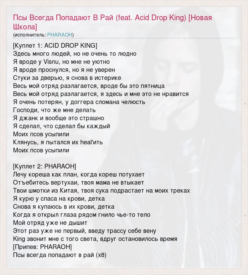[Куплет 1: ACID DROP KING] Здесь много людей, но не очень то людно Я вроде у Visnu, но мне не уютно Я вроде проснулся, но я не уверен Стуки за дверью, я снова в истерике Весь мой отряд разлагается, вроде бы это пятница Весь мой отряд разлагается, я здесь и мне это не нравится Я очень потерян, у доггера сломана челюсть Господи, что же мне делать Я джанк и вообще это страшно Я сделал, что сделал бы каждый Моих псов усыпили Клянусь, я пытался их heal'ить Моих псов усыпили [Куплет 2: PHARAOH] Лечу кореша как план, когда кореш потухает Отъебитесь вертухаи, твоя мама не втыкает Твои шмотки из Китая, твоя сука подрастает на моих треках Я курю у спаса на крови, детка Снова я купаюсь в их крови, детка Когда я открыл глаза рядом гнило чье-то тело Мой отряд уже не дышит Этот раз уже не первый, введу трассу себе вену King звонит мне с того света, вдруг остановилось время [Припев: PHARAOH] Псы всегда попадают в рай (x8)