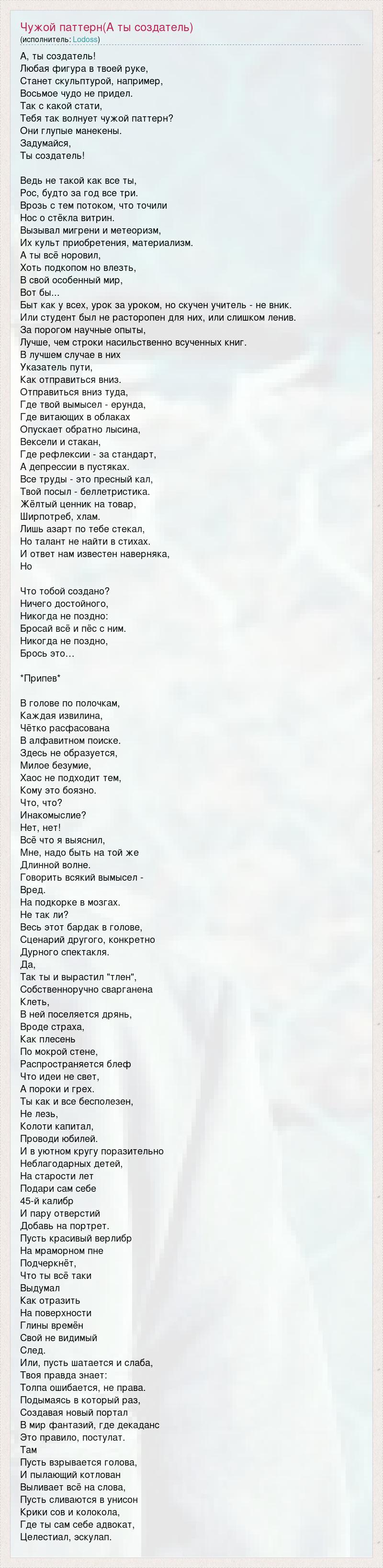 А, ты создатель! Любая фигура в твоей руке, Станет скульптурой, например, Восьмое чудо не придел. Так с какой стати, Тебя так волнует чужой паттерн? Они глупые манекены. Задумайся, Ты создатель! Ведь не такой как все ты, Рос, будто за год все три. Врозь с тем потоком, что точили Нос о стёкла витрин. Вызывал мигрени и метеоризм, Их культ приобретения, материализм. А ты всё норовил, Хоть подкопом но влезть, В свой особенный мир, Вот бы... Быт как у всех, урок за уроком, но скучен учитель - не вник. Или студент был не расторопен для них, или слишком ленив. За порогом научные опыты, Лучше, чем строки насильственно всученных книг. В лучшем случае в них Указатель пути, Как отправиться вниз. Отправиться вниз туда, Где твой вымысел - ерунда, Где витающих в облаках Опускает обратно лысина, Вексели и стакан, Где рефлексии - за стандарт, А депрессии в пустяках. Все труды - это пресный кал, Твой посыл - беллетристика. Жёлтый ценник на товар, Ширпотреб, хлам. Лишь азарт по тебе стекал, Но талант не найти в стихах. И ответ нам известен наверняка, Но Что тобой создано? Ничего достойного, Никогда не поздно: Бросай всё и пёс с ним. Никогда не поздно, Брось это… *Припев* В голове по полочкам, Каждая извилина, Чётко расфасована В алфавитном поиске. Здесь не образуется, Милое безумие, Хаос не подходит тем, Кому это боязно. Что, что? Инакомыслие? Нет, нет! Всё что я выяснил, Мне, надо быть на той же Длинной волне. Говорить всякий вымысел - Вред. На подкорке в мозгах. Не так ли? Весь этот бардак в голове, Сценарий другого, конкретно Дурного спектакля. Да, Так ты и вырастил "тлен", Собственноручно сварганена Клеть, В ней поселяется дрянь, Вроде страха, Как плесень По мокрой стене, Распространяется блеф Что идеи не свет, А пороки и грех. Ты как и все бесполезен, Не лезь, Колоти капитал, Проводи юбилей. И в уютном кругу поразительно Неблагодарных детей, На старости лет Подари сам себе 45-й калибр И пару отверстий Добавь на портрет. Пусть красивый верлибр На мраморном пне Подчеркнёт, Что ты всё таки Выдумал Как отразить На поверхности Глины времён Свой не видимый След. Или, пусть шатается и слаба, Твоя правда знает: Толпа ошибается, не права. Подымаясь в который раз, Создавая новый портал В мир фантазий, где декаданс Это правило, постулат. Там Пусть взрывается голова, И пылающий котлован Выливает всё на слова, Пусть сливаются в унисон Крики сов и колокола, Где ты сам себе адвокат, Целестиал, эскулап.
