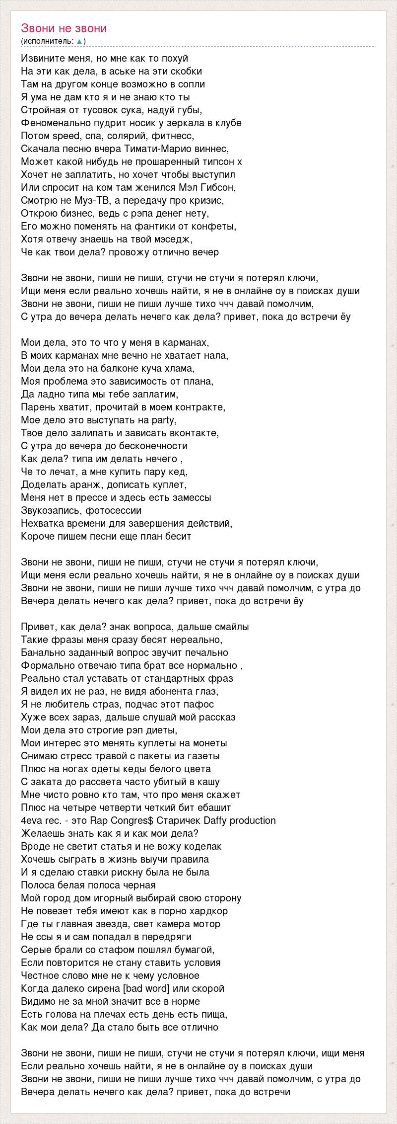 Извините меня, но мне как то похуй На эти как дела, в аське на эти скобки Там на другом конце возможно в сопли Я ума не дам кто я и не знаю кто ты Стройная от тусовок сука, надуй губы, Феноменально пудрит носик у зеркала в клубе Потом speed, спа, солярий, фитнесс, Скачала песню вчера Тимати-Марио виннес, Может какой нибудь не прошаренный типсон х Хочет не заплатить, но хочет чтобы выступил Или спросит на ком там женился Мэл Гибсон, Смотрю не Муз-ТВ, а передачу про кризис, Открою бизнес, ведь с рэпа денег нету, Его можно поменять на фантики от конфеты, Хотя отвечу знаешь на твой мэседж, Че как твои дела? провожу отлично вечер Звони не звони, пиши не пиши, стучи не стучи я потерял ключи, Ищи меня если реально хочешь найти, я не в онлайне оу в поисках души Звони не звони, пиши не пиши лучше тихо ччч давай помолчим, С утра до вечера делать нечего как дела? привет, пока до встречи ёу Мои дела, это то что у меня в карманах, В моих карманах мне вечно не хватает нала, Мои дела это на балконе куча хлама, Моя проблема это зависимость от плана, Да ладно типа мы тебе заплатим, Парень хватит, прочитай в моем контракте, Мое дело это выступать на party, Твое дело залипать и зависать вконтакте, С утра до вечера до бесконечности Как дела? типа им делать нечего , Че то лечат, а мне купить пару кед, Доделать аранж, дописать куплет, Меня нет в прессе и здесь есть замессы Звукозапись, фотосессии Нехватка времени для завершения действий, Короче пишем песни еще план бесит Звони не звони, пиши не пиши, стучи не стучи я потерял ключи, Ищи меня если реально хочешь найти, я не в онлайне оу в поисках души Звони не звони, пиши не пиши лучше тихо ччч давай помолчим, с утра до Вечера делать нечего как дела? привет, пока до встречи ёу Привет, как дела? знак вопроса, дальше смайлы Такие фразы меня сразу бесят нереально, Банально заданный вопрос звучит печально Формально отвечаю типа брат все нормально , Реально стал уставать от стандартных фраз Я видел их не раз, не видя абонента глаз, Я не любитель страз, подчас этот пафос Хуже всех зараз, дальше слушай мой рассказ Мои дела это строгие рэп диеты, Мои интерес это менять куплеты на монеты Снимаю стресс травой с пакеты из газеты Плюс на ногах одеты кеды белого цвета С заката до рассвета часто убитый в кашу Мне чисто ровно кто там, что про меня скажет Плюс на четыре четверти четкий бит ебашит 4eva rec. - это Rap Congres$ Старичек Daffy production Желаешь знать как я и как мои дела? Вроде не светит статья и не вожу коделак Хочешь сыграть в жизнь выучи правила И я сделаю ставки рискну была не была Полоса белая полоса черная Мой город дом игорный выбирай свою сторону Не повезет тебя имеют как в порно хардкор Где ты главная звезда, свет камера мотор Не ссы я и сам попадал в передряги Серые брали со стафом пошлял бумагой, Если повторится не стану ставить условия Честное слово мне не к чему условное Когда далеко сирена [bad word] или скорой Видимо не за мной значит все в норме Есть голова на плечах есть день есть пища, Как мои дела? Да стало быть все отлично Звони не звони, пиши не пиши, стучи не стучи я потерял ключи, ищи меня Если реально хочешь найти, я не в онлайне оу в поисках души Звони не звони, пиши не пиши лучше тихо ччч давай помолчим, с утра до Вечера делать нечего как дела? привет, пока до встречи