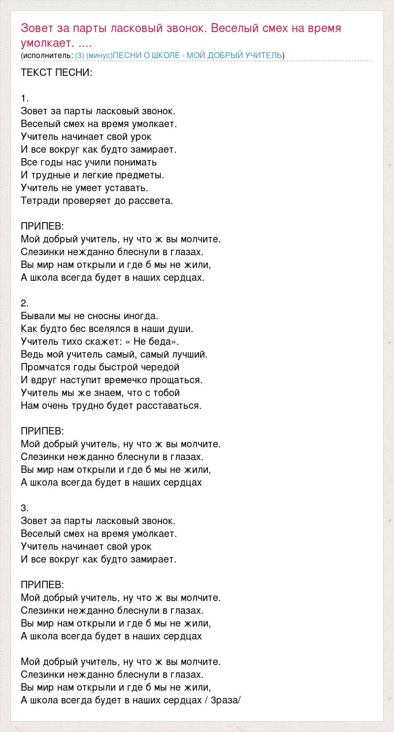 ТЕКСТ ПЕСНИ: 1. Зовет за парты ласковый звонок. Веселый смех на время умолкает. Учитель начинает свой урок И все вокруг как будто замирает. Все годы нас учили понимать И трудные и легкие предметы. Учитель не умеет уставать. Тетради проверяет до рассвета. ПРИПЕВ: Мой добрый учитель, ну что ж вы молчите. Слезинки нежданно блеснули в глазах. Вы мир нам открыли и где б мы не жили, А школа всегда будет в наших сердцах. 2. Бывали мы не сносны иногда. Как будто бес вселялся в наши души. Учитель тихо скажет: « Не беда». Ведь мой учитель самый, самый лучший. Промчатся годы быстрой чередой И вдруг наступит времечко прощаться. Учитель мы же знаем, что с тобой Нам очень трудно будет расставаться. ПРИПЕВ: Мой добрый учитель, ну что ж вы молчите. Слезинки нежданно блеснули в глазах. Вы мир нам открыли и где б мы не жили, А школа всегда будет в наших сердцах 3. Зовет за парты ласковый звонок. Веселый смех на время умолкает. Учитель начинает свой урок И все вокруг как будто замирает. ПРИПЕВ: Мой добрый учитель, ну что ж вы молчите. Слезинки нежданно блеснули в глазах. Вы мир нам открыли и где б мы не жили, А школа всегда будет в наших сердцах Мой добрый учитель, ну что ж вы молчите. Слезинки нежданно блеснули в глазах. Вы мир нам открыли и где б мы не жили, А школа всегда будет в наших сердцах / 3раза/