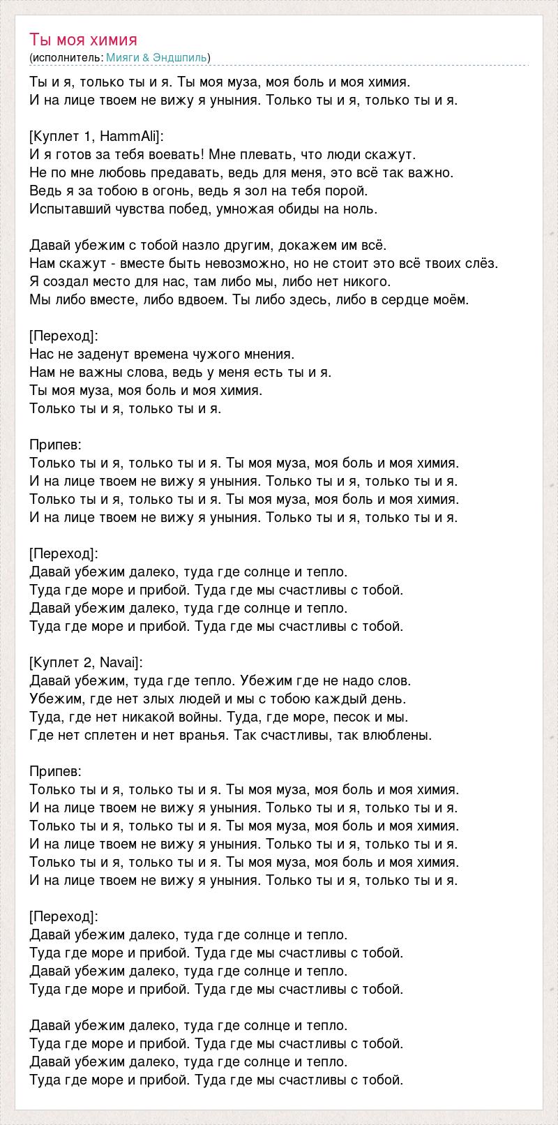 Ты и я, только ты и я. Ты моя муза, моя боль и моя химия. И на лице твоем не вижу я уныния. Только ты и я, только ты и я. [Куплет 1, HammAli]: И я готов за тебя воевать! Мне плевать, что люди скажут. Не по мне любовь предавать, ведь для меня, это всё так важно. Ведь я за тобою в огонь, ведь я зол на тебя порой. Испытавший чувства побед, умножая обиды на ноль. Давай убежим с тобой назло другим, докажем им всё. Нам скажут - вместе быть невозможно, но не стоит это всё твоих слёз. Я создал место для нас, там либо мы, либо нет никого. Мы либо вместе, либо вдвоем. Ты либо здесь, либо в сердце моём. [Переход]: Нас не заденут времена чужого мнения. Нам не важны слова, ведь у меня есть ты и я. Ты моя муза, моя боль и моя химия. Только ты и я, только ты и я. Припев: Только ты и я, только ты и я. Ты моя муза, моя боль и моя химия. И на лице твоем не вижу я уныния. Только ты и я, только ты и я. Только ты и я, только ты и я. Ты моя муза, моя боль и моя химия. И на лице твоем не вижу я уныния. Только ты и я, только ты и я. [Переход]: Давай убежим далеко, туда где солнце и тепло. Туда где море и прибой. Туда где мы счастливы с тобой. Давай убежим далеко, туда где солнце и тепло. Туда где море и прибой. Туда где мы счастливы с тобой. [Куплет 2, Navai]: Давай убежим, туда где тепло. Убежим где не надо слов. Убежим, где нет злых людей и мы с тобою каждый день. Туда, где нет никакой войны. Туда, где море, песок и мы. Где нет сплетен и нет вранья. Так счастливы, так влюблены. Припев: Только ты и я, только ты и я. Ты моя муза, моя боль и моя химия. И на лице твоем не вижу я уныния. Только ты и я, только ты и я. Только ты и я, только ты и я. Ты моя муза, моя боль и моя химия. И на лице твоем не вижу я уныния. Только ты и я, только ты и я. Только ты и я, только ты и я. Ты моя муза, моя боль и моя химия. И на лице твоем не вижу я уныния. Только ты и я, только ты и я. [Переход]: Давай убежим далеко, туда где солнце и тепло. Туда где море и прибой. Туда где мы счастливы с тобой. Давай убежим далеко, туда где солнце и тепло. Туда где море и прибой. Туда где мы счастливы с тобой. Давай убежим далеко, туда где солнце и тепло. Туда где море и прибой. Туда где мы счастливы с тобой. Давай убежим далеко, туда где солнце и тепло. Туда где море и прибой. Туда где мы счастливы с тобой.